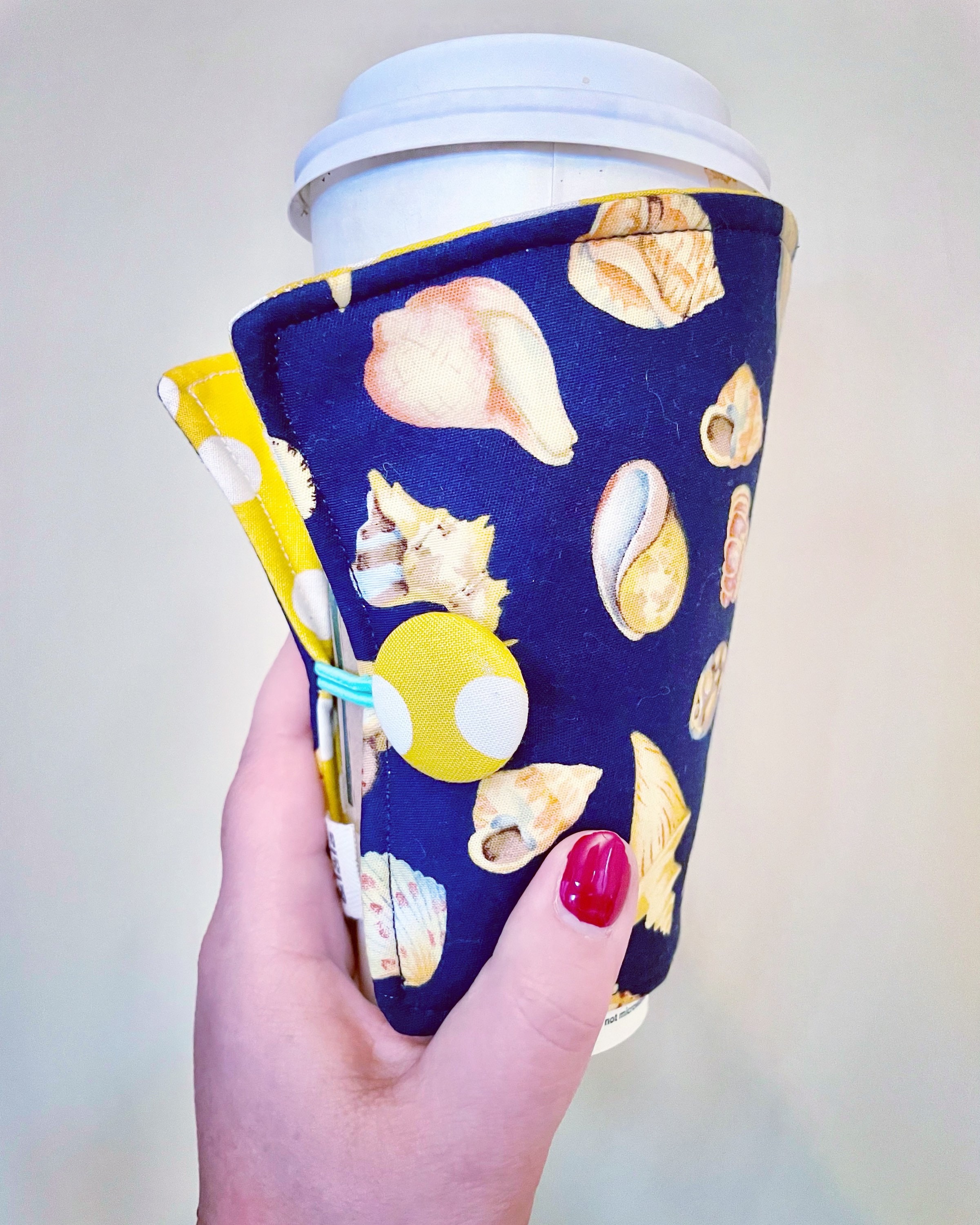 Beautiful seashell pattern with navy background on one side, a coordinating pattern on the reverse. Handmade coffee cozy that will keep your iced coffee from leaving puddles and keep hot drinks warm longer! Cotton fabric with an insulated layer on the inside. Elastic/button closure allows this to fit ALL drink cups! The contrasting fabric on the inside just ups the cuteness factor! A great gift for anyone (or yourself!)