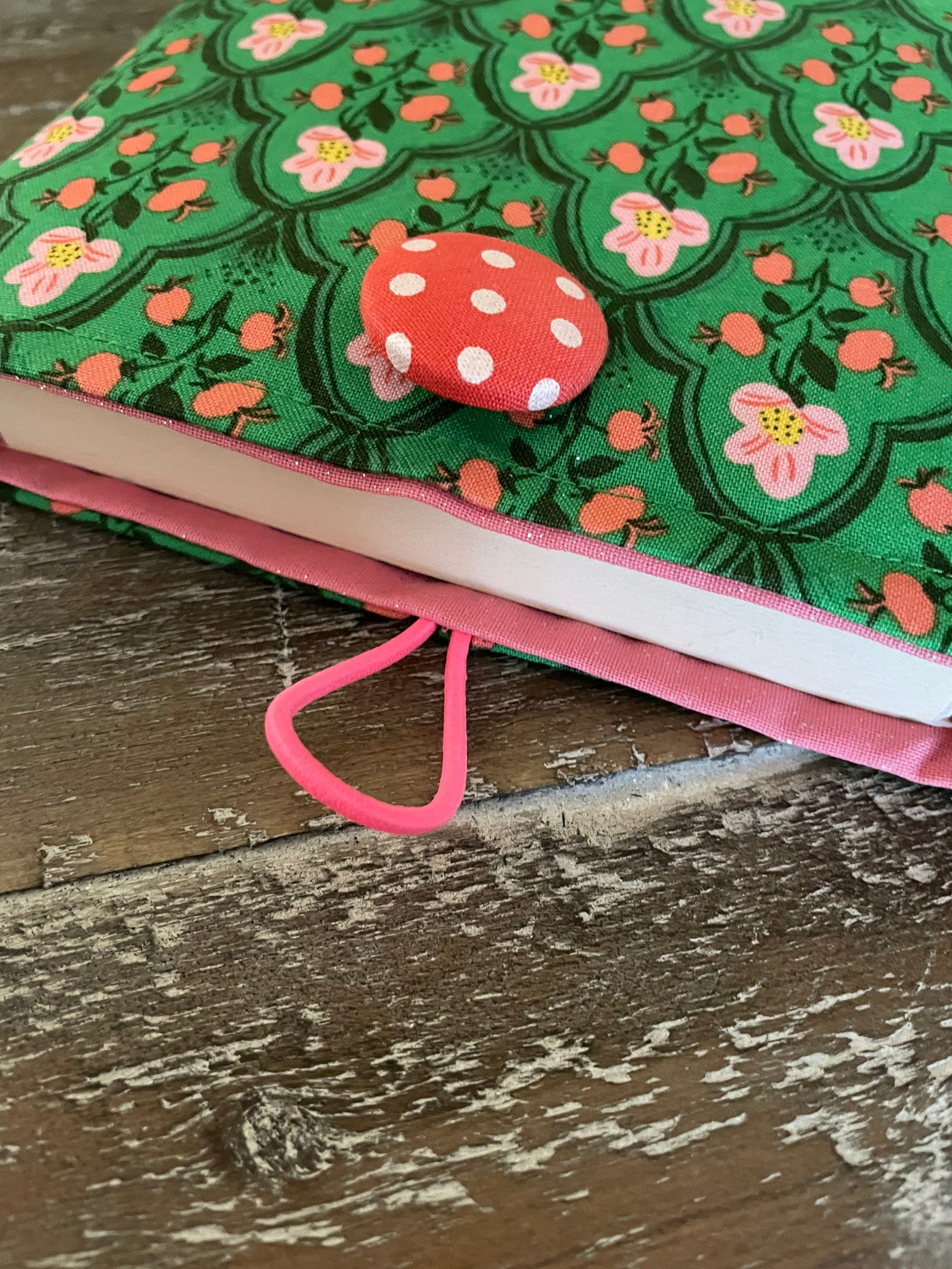A handmade padded pouch to keep your books safe while traveling or while in your handbag. Cotton fabric, lined with a coordinating cotton and padded with fleece. Elastic and button closure. Two sizes: softcover (7.5”x9.5”), and hardcover (8.5”x11”).