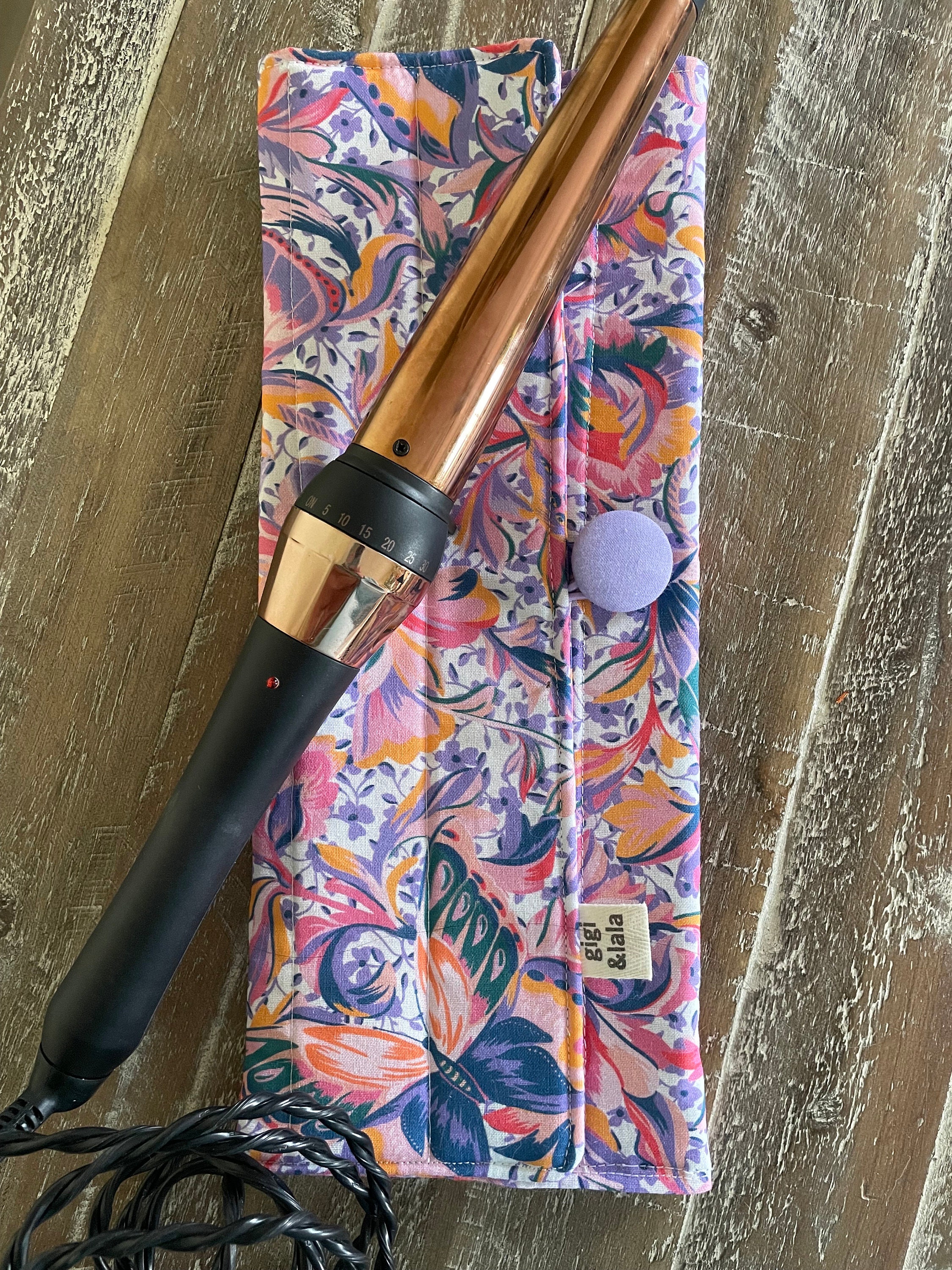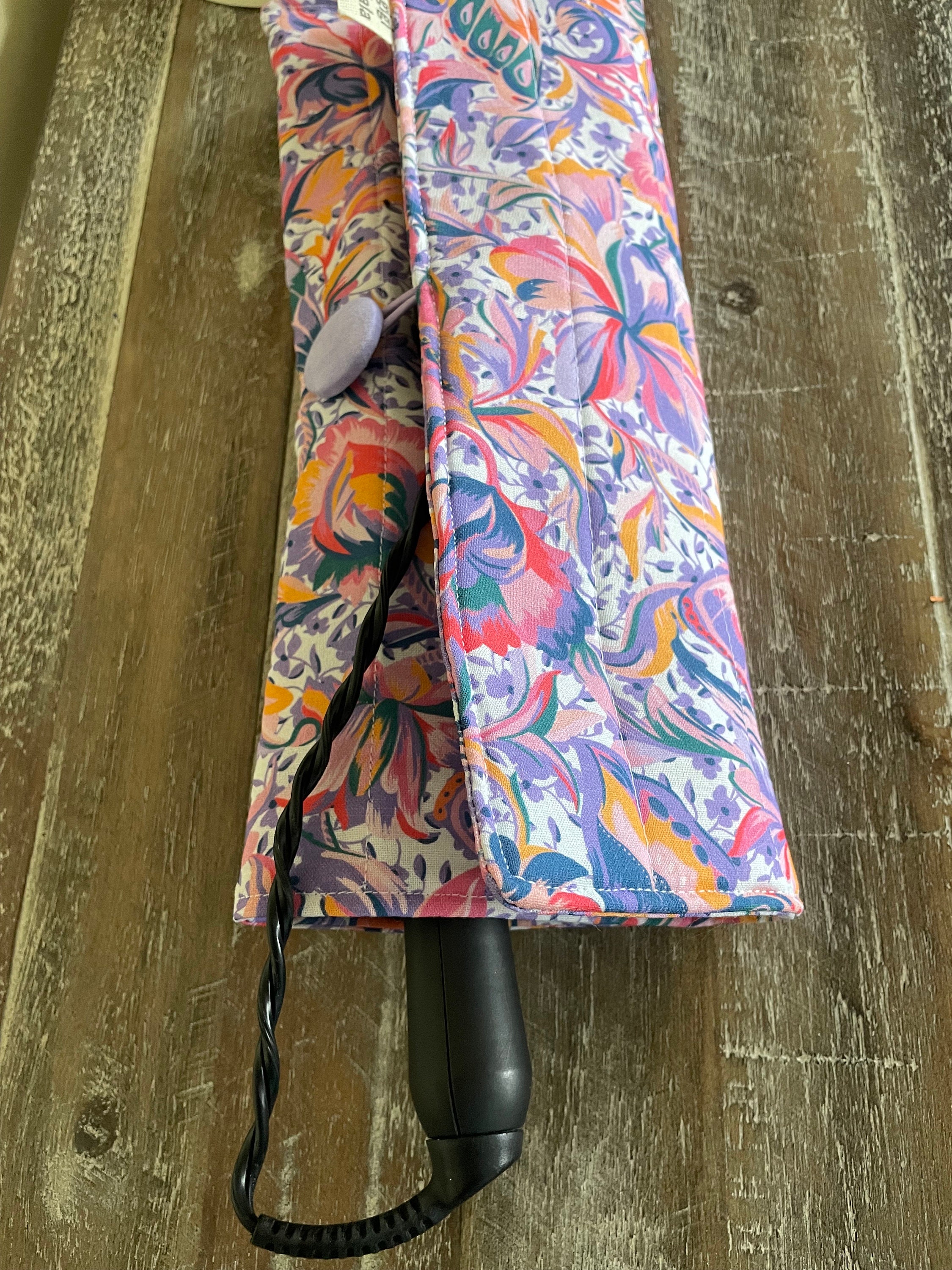 Pack up your hair iron while it’s still hot! A handmade insulated pouch keeps flat irons, curling irons, or other heat tools wrapped up safely while keeping the cord away from the hot iron surface. Pouch measures 8”x12”when open, interior pouch is 4.5”x12”.