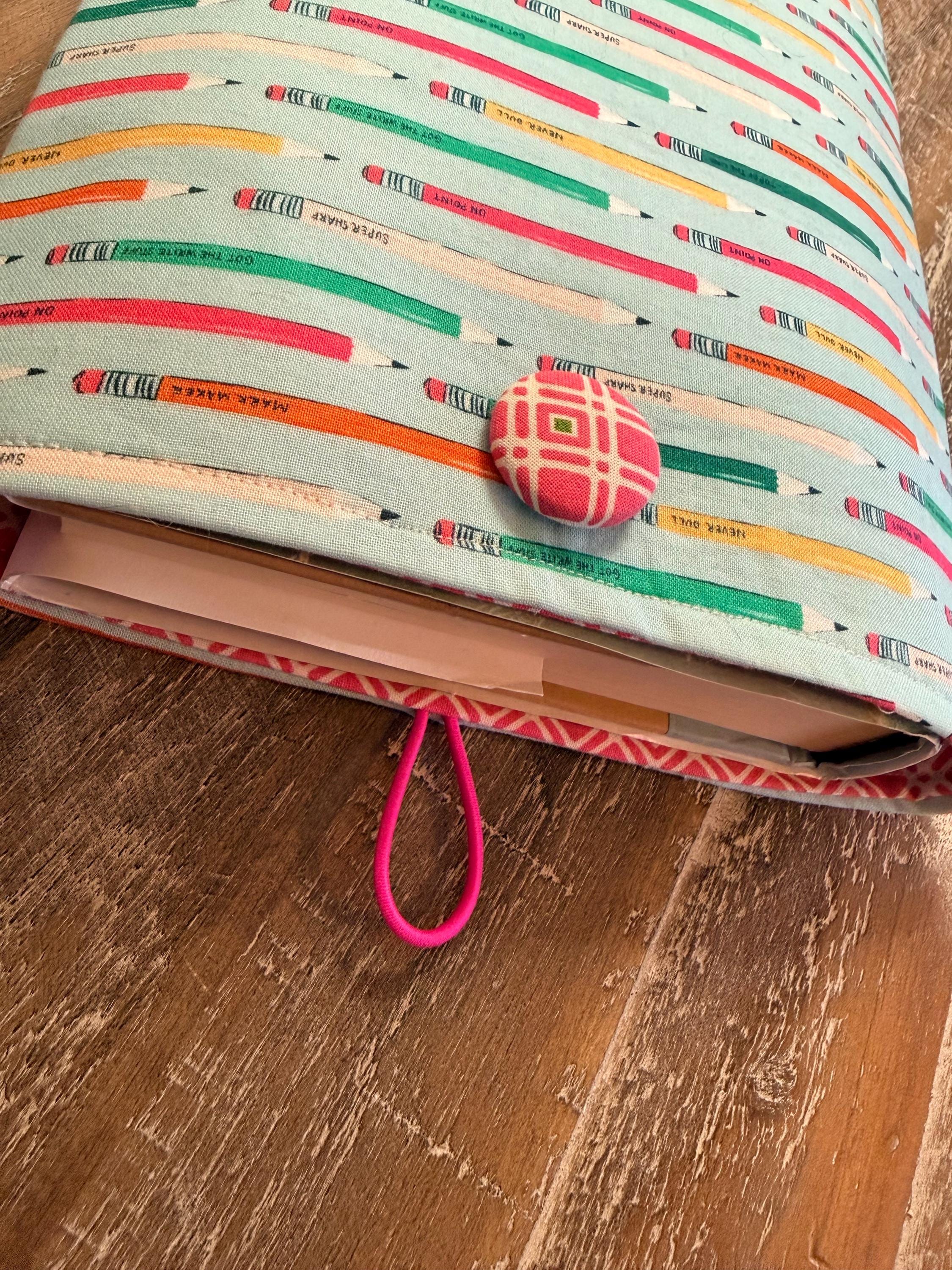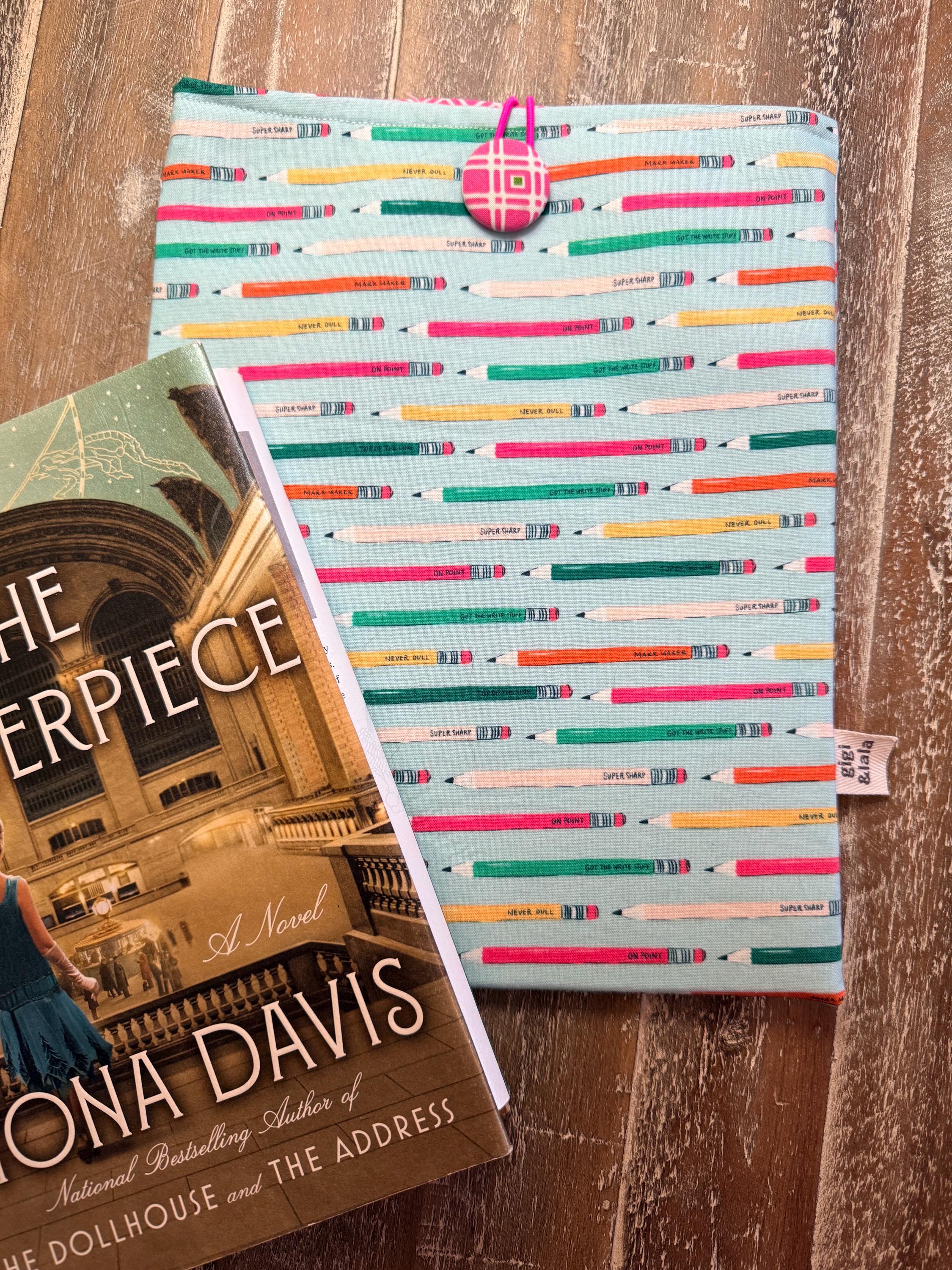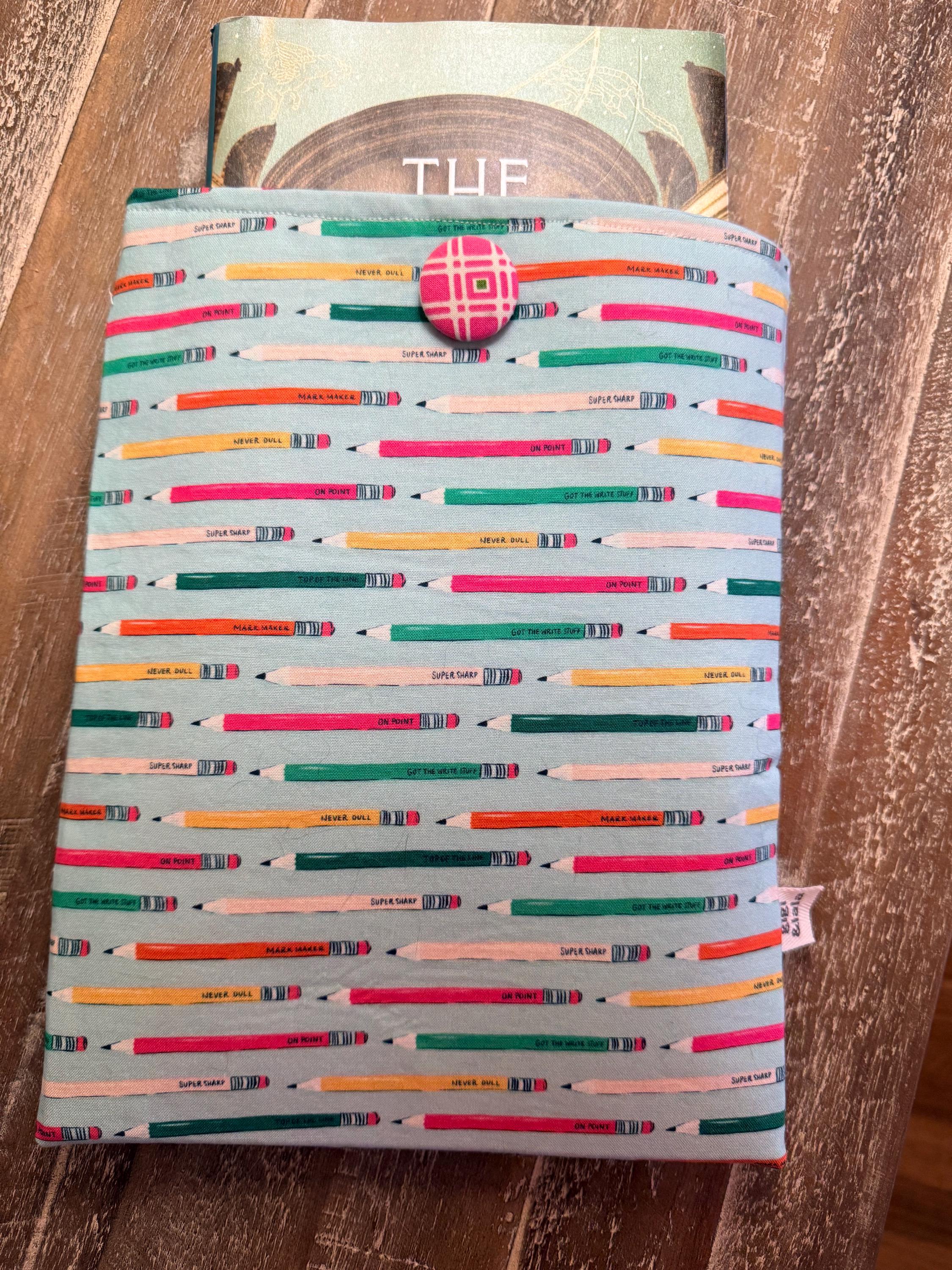 A handmade padded pouch to keep your books safe while traveling or while in your handbag. Cotton fabric, lined with a coordinating cotton and padded with fleece. Elastic and button closure. Two sizes: softcover (7.5”x9.5”), and hardcover (8.5”x11”). Can be used as a tablet pouch as well!