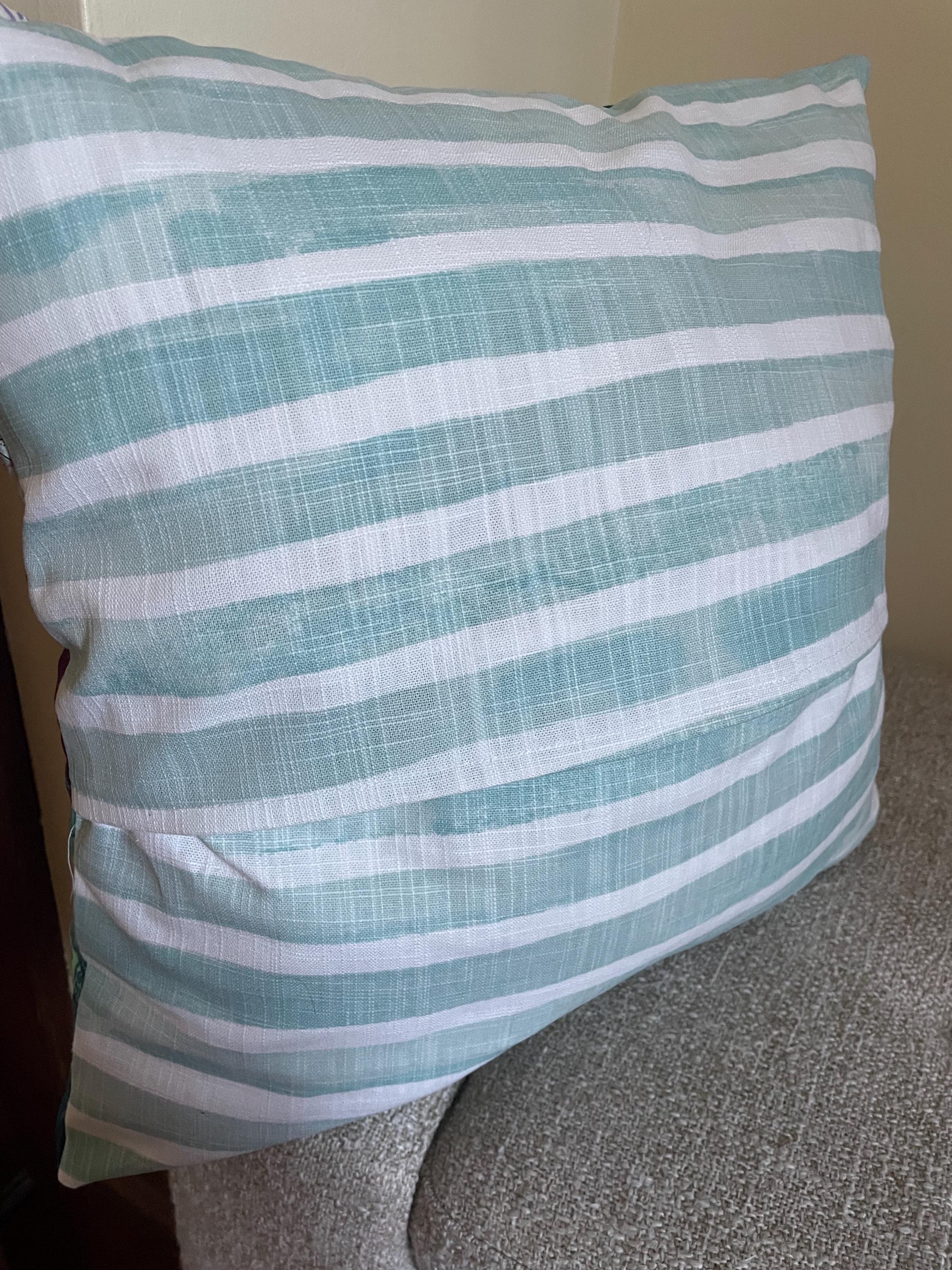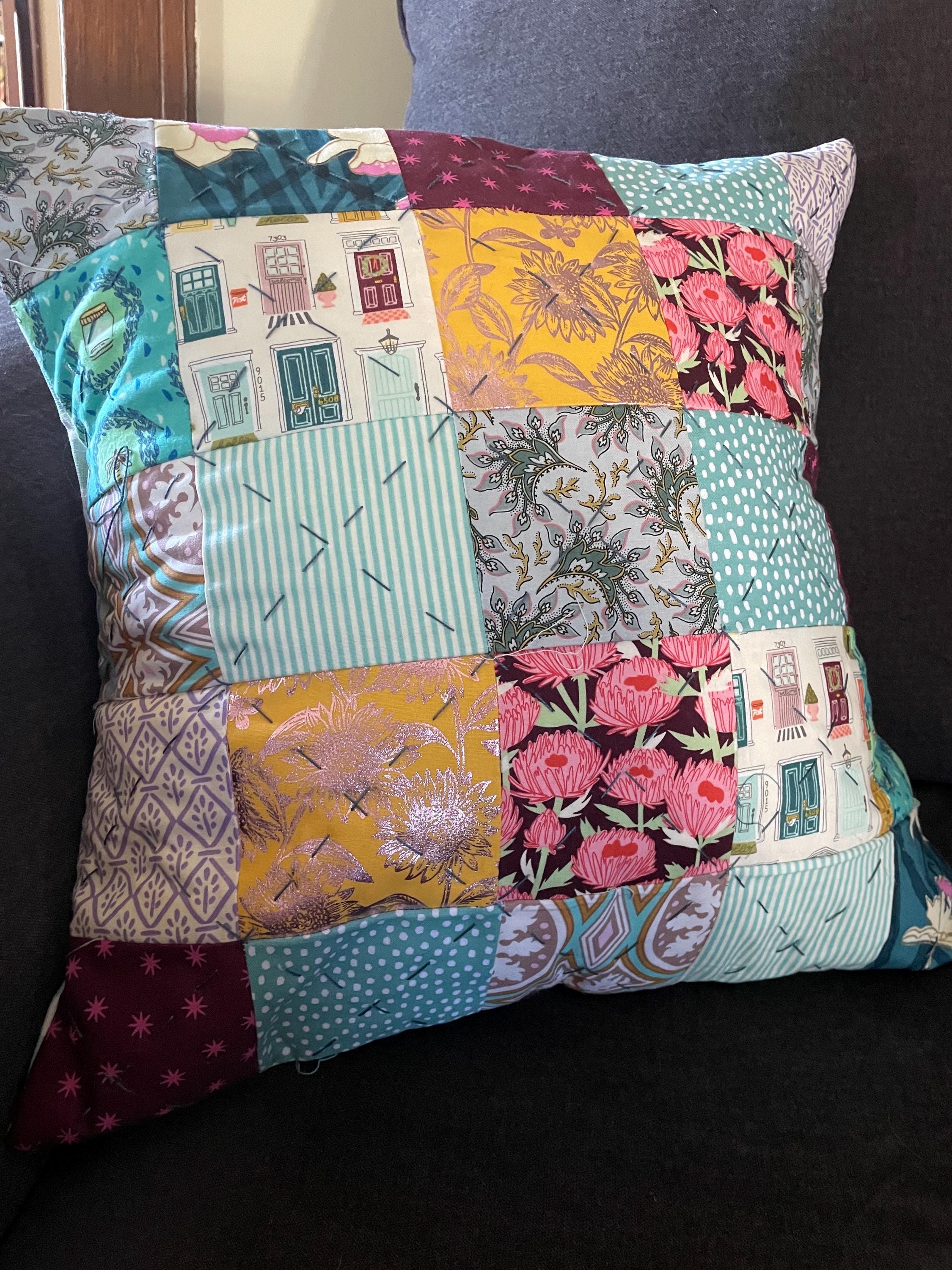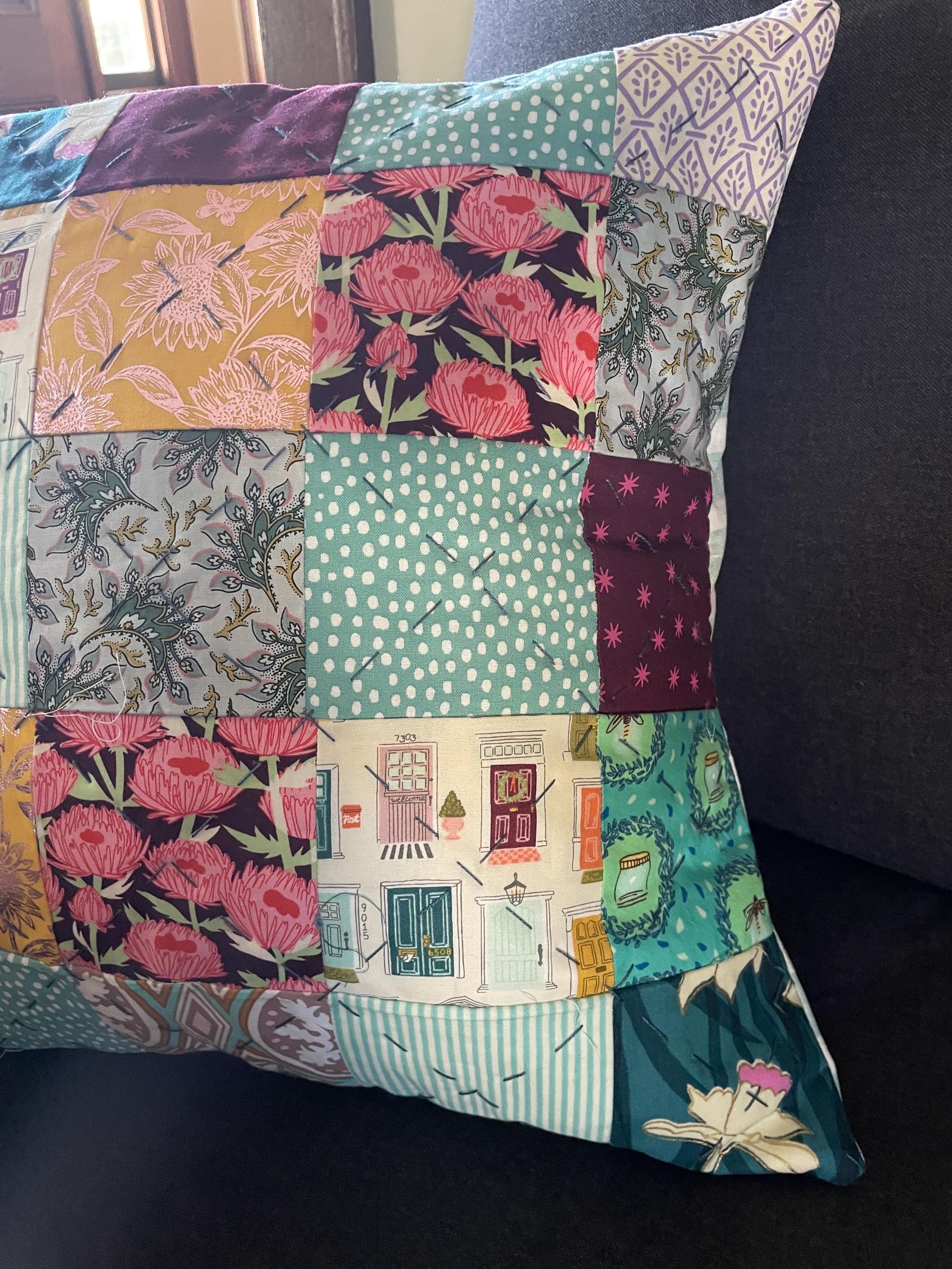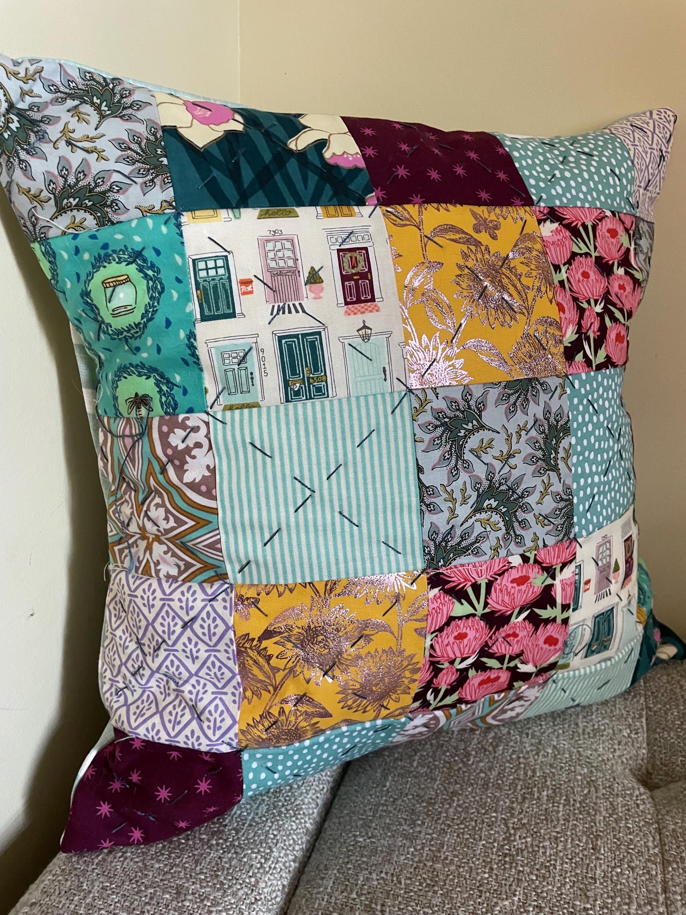 Perk up your decor with a pop of patchwork! Hand-quilted patchwork pillow cover, made from mix of new and vintage fabrics, quilted with pearl cotton thread with visible hand stitches. Envelope style pillow cover (no zipper), backing fabric is sturdy fade-resistant canvas. Pillow cover measures 17”x17”.
