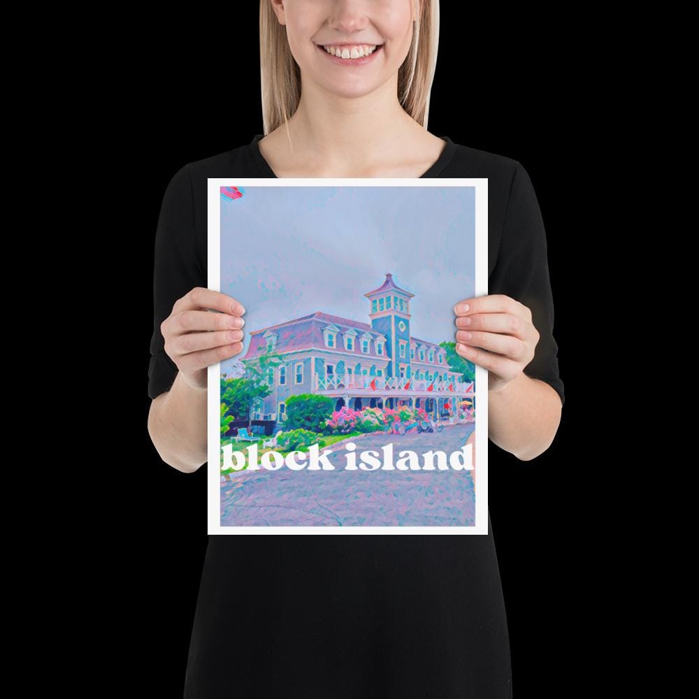 Block Island, Rhode Island is my favorite place on Earth and I'm so lucky to spend time there each year. This is my own photo, edited by me, of the Surf Hotel in the evening. These are 11"x14" museum-quality posters made on thick matte paper.