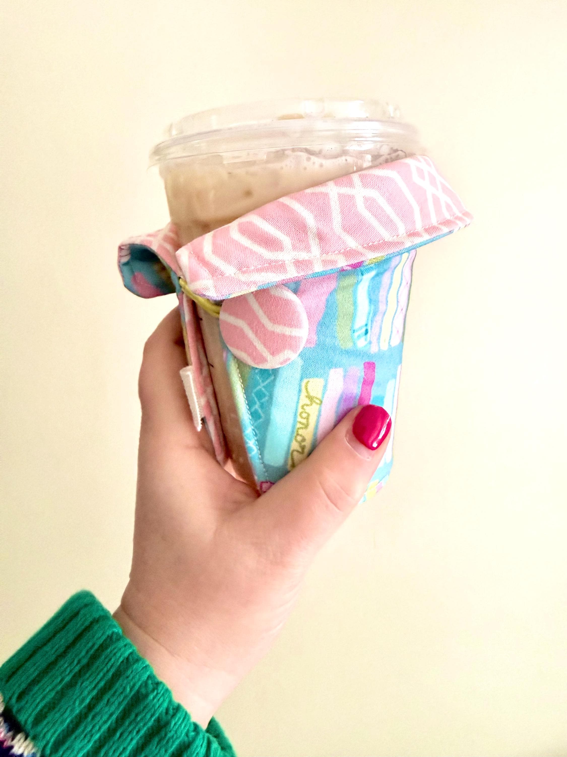 Our own hand-drawn bookshelf print on one side, a coordinating pattern on the reverse. Handmade coffee cozy that will keep your iced coffee from leaving puddles and keep hot drinks warm longer! Cotton fabric with an insulated layer on the inside. Elastic/button closure allows this to fit ALL drink cups! The contrasting fabric on the inside just ups the cuteness factor! A great gift for anyone (or yourself!)