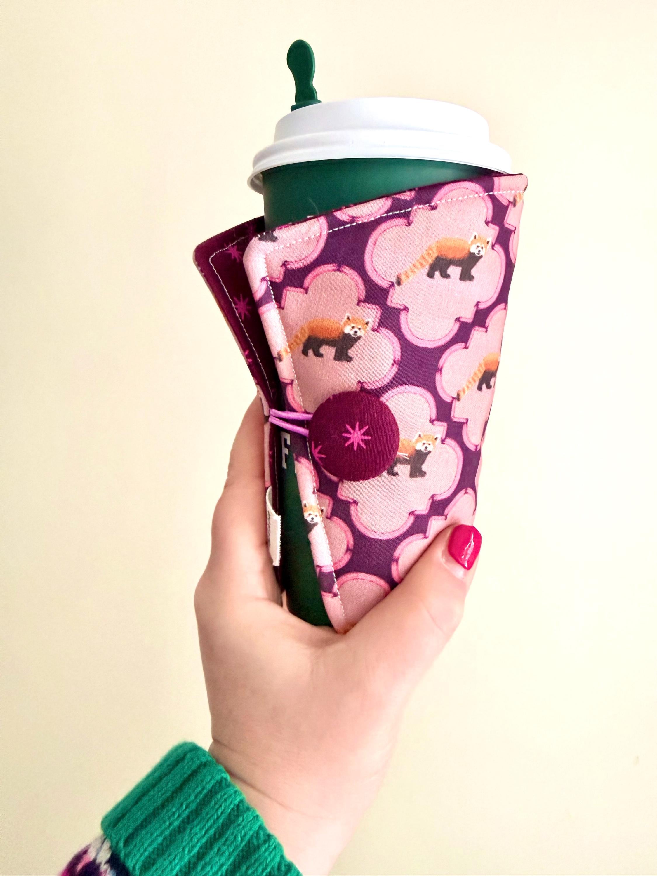 Our own hand-drawn red panda print on one side, a coordinating pattern on the reverse. Handmade coffee cozy that will keep your iced coffee from leaving puddles and keep hot drinks warm longer! Cotton fabric with an insulated layer on the inside. Elastic/button closure allows this to fit ALL drink cups! The contrasting fabric on the inside just ups the cuteness factor! A great gift for anyone (or yourself!)