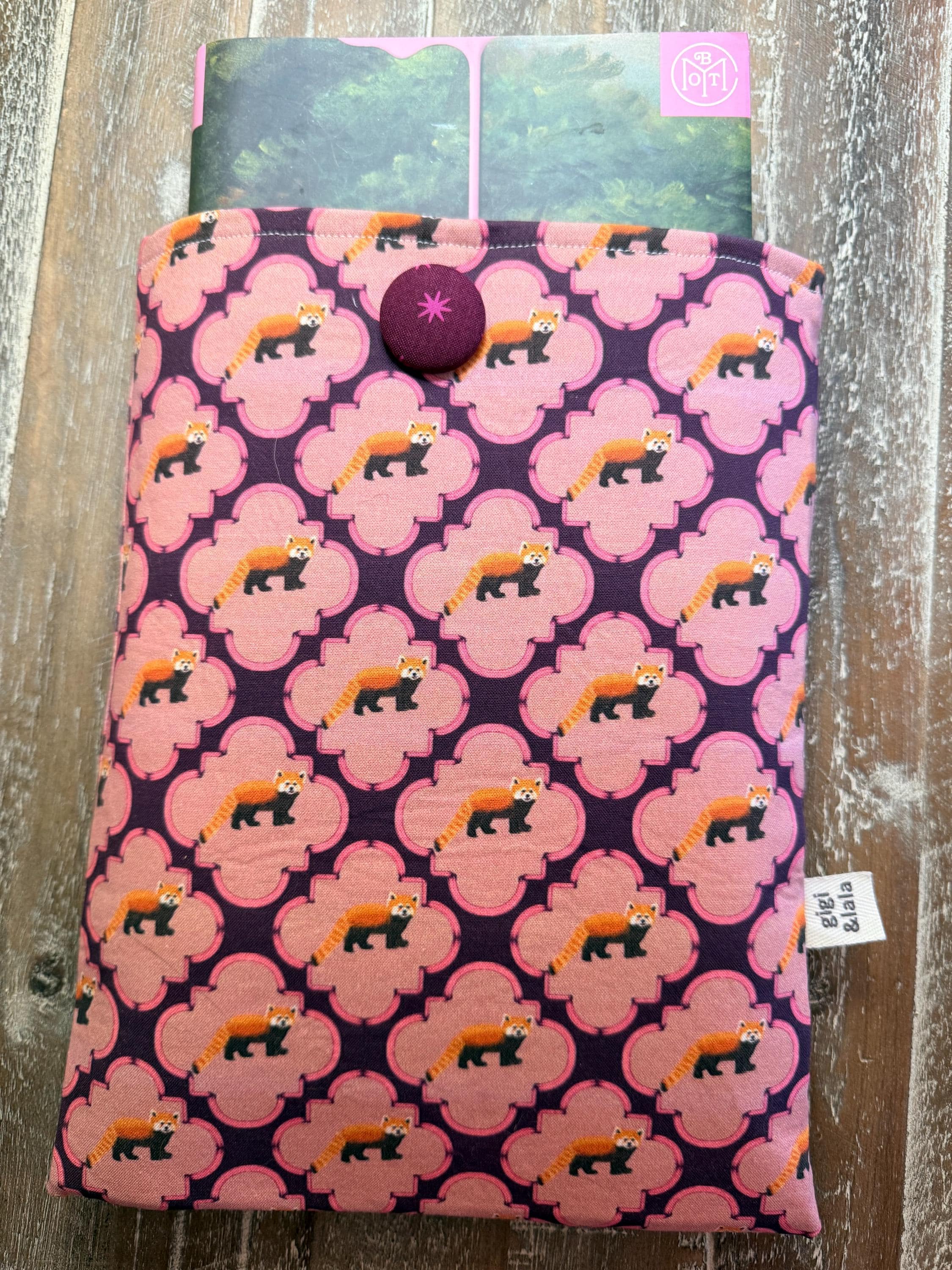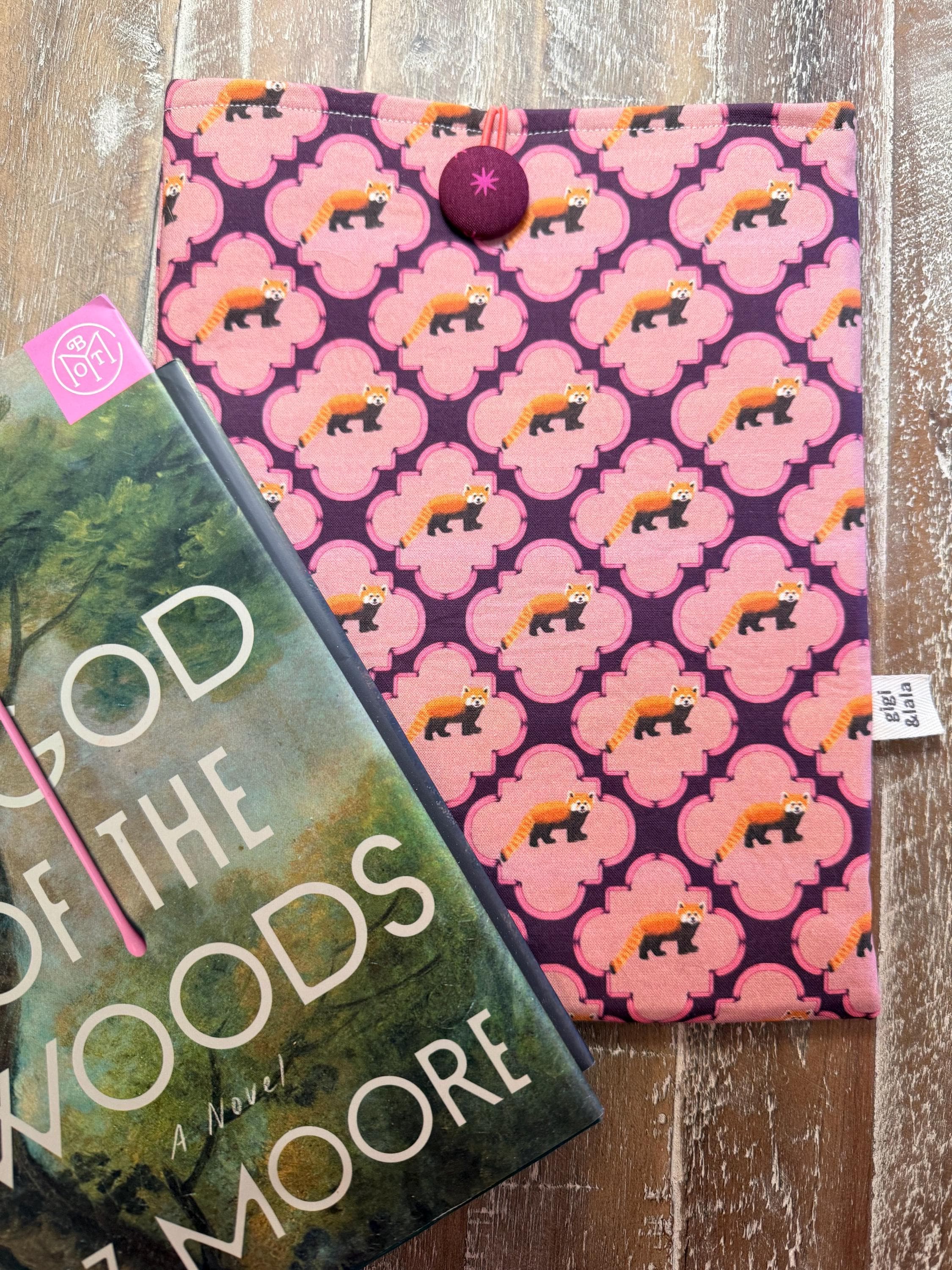 Handmade Padded Book Sleeve: Red Panda parade on Plum hand-drawn Print