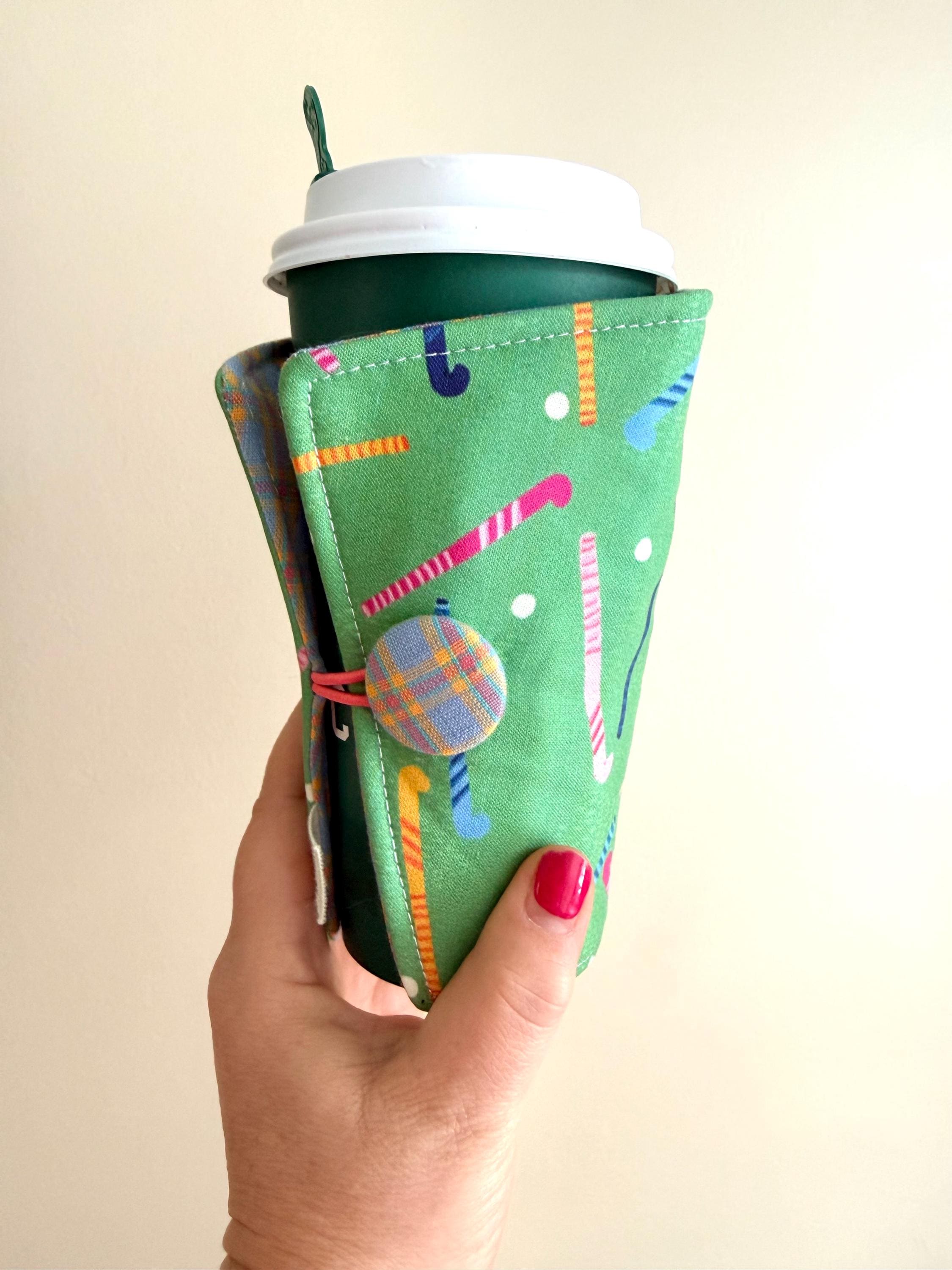 Our own hand-drawn field hockey print on one side, a coordinating pattern on the reverse. Handmade coffee cozy that will keep your iced coffee from leaving puddles and keep hot drinks warm longer! Cotton fabric with an insulated layer on the inside. Elastic/button closure allows this to fit ALL drink cups! The contrasting fabric on the inside just ups the cuteness factor! A great gift for anyone (or yourself!)