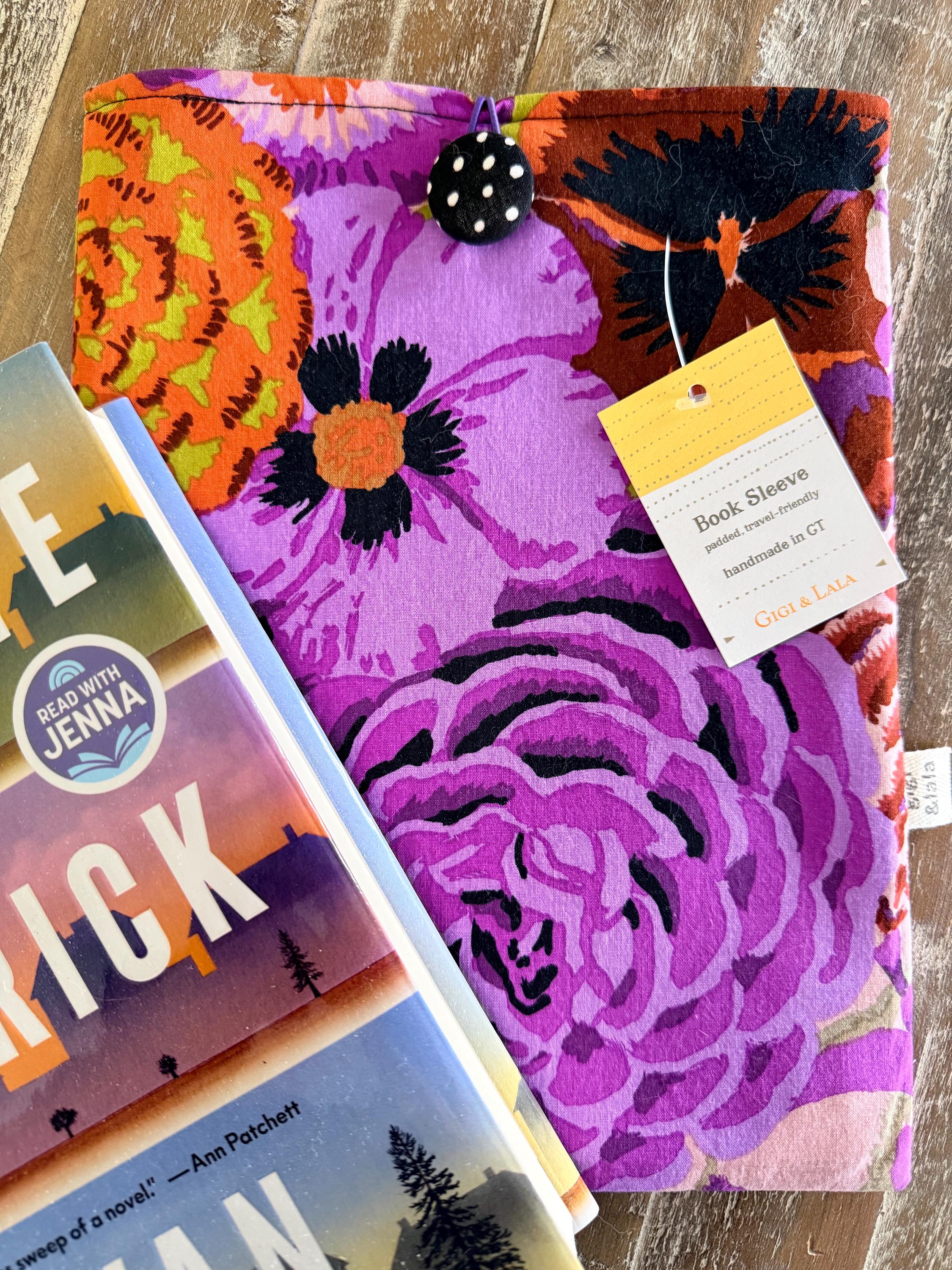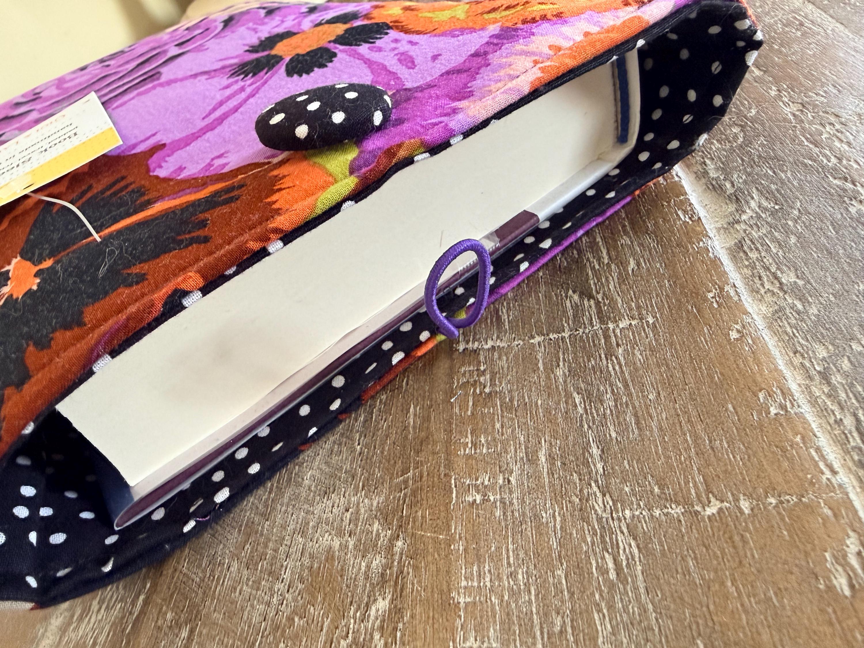 A handmade padded pouch to keep your books safe while traveling or while in your handbag. Cotton fabric, lined with a coordinating cotton and padded with fleece. Elastic and button closure. Two sizes: softcover (7.5”x9.5”), and hardcover (8.5”x11”). Can be used as a tablet pouch as well!