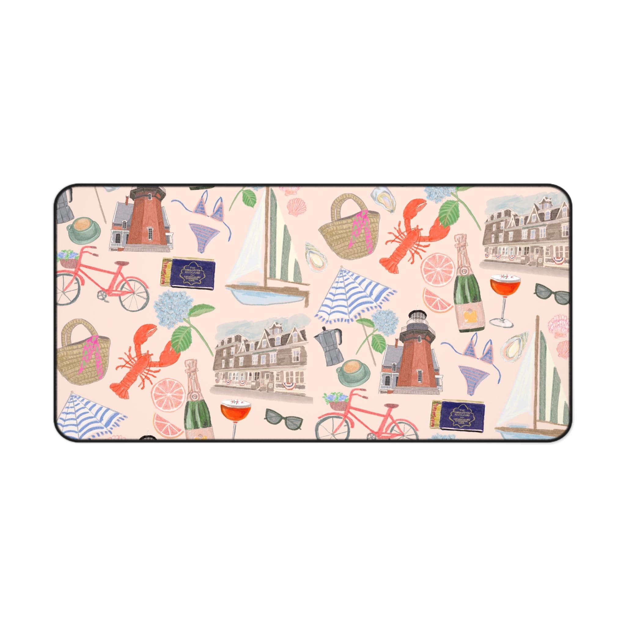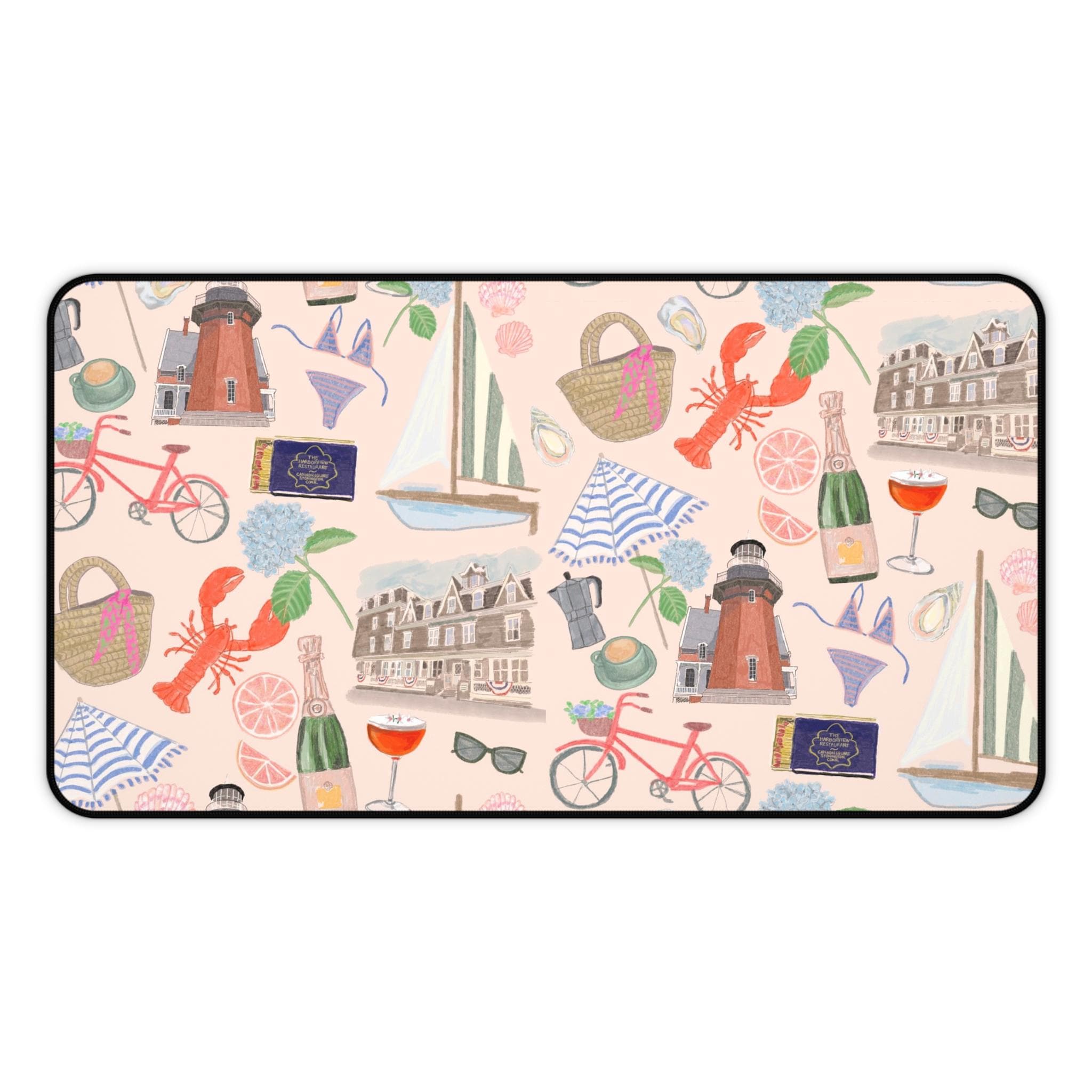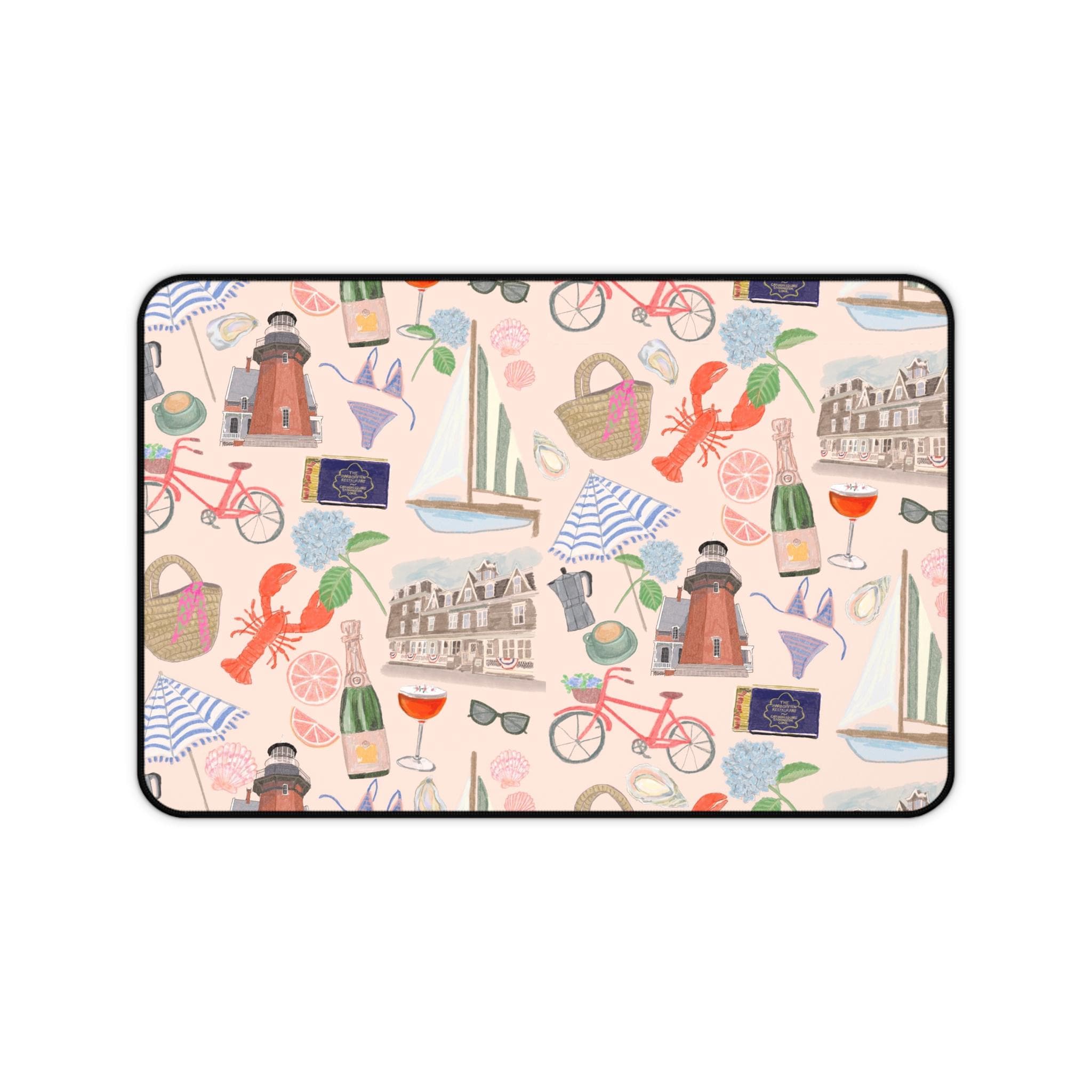Bring a seaside daydream to your workspace with this cushioned desk mat. Soft neoprene top showcases hand-drawn prints of lighthouses, sailboats, bicycles, and coastal treats, while the textured, anti-slip underside keeps everything steady during long writing, typing, or crafting sessions. Hemmed edges add durability so the colors and pattern stay crisp through daily use. Choose from three sizes to anchor a compact laptop nook or a wide creative desk. It’s the kind of piece that turns routine work into a calm, inspired moment — like a short escape to the harbor between tasks.