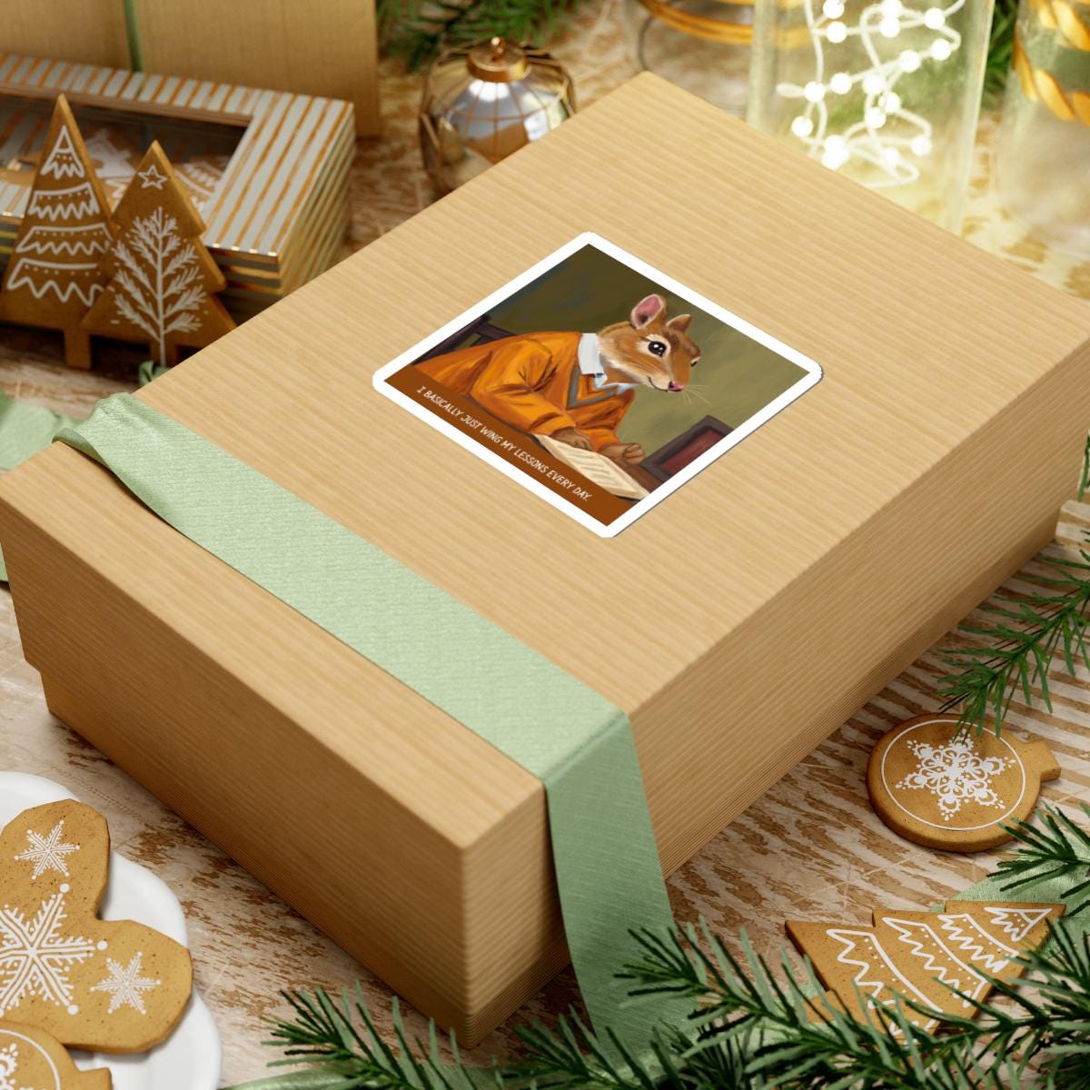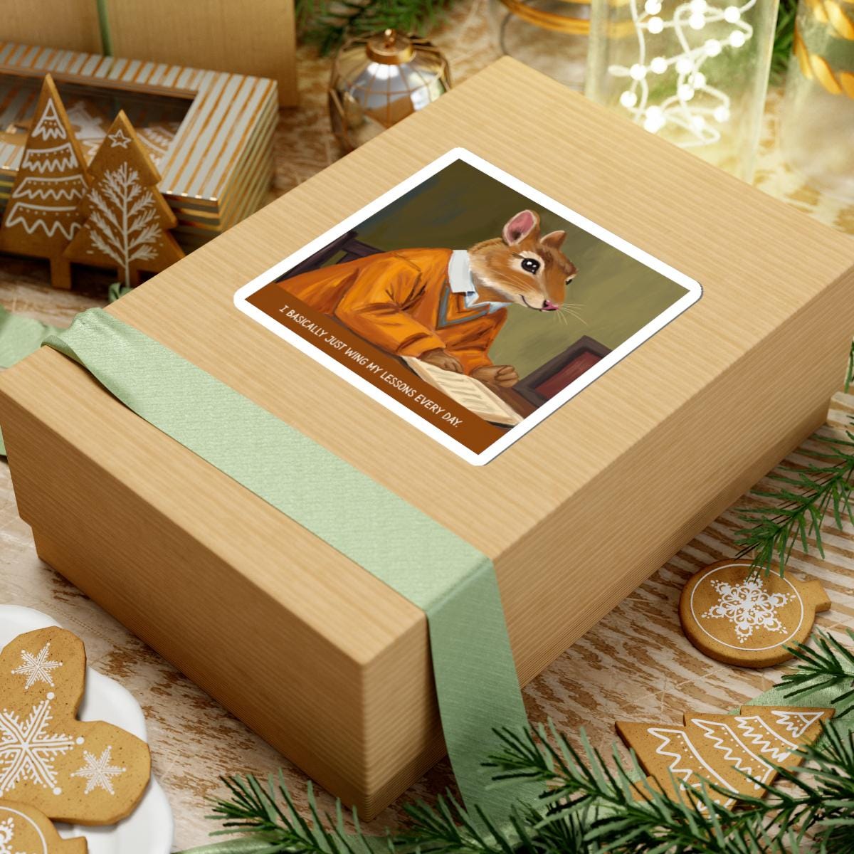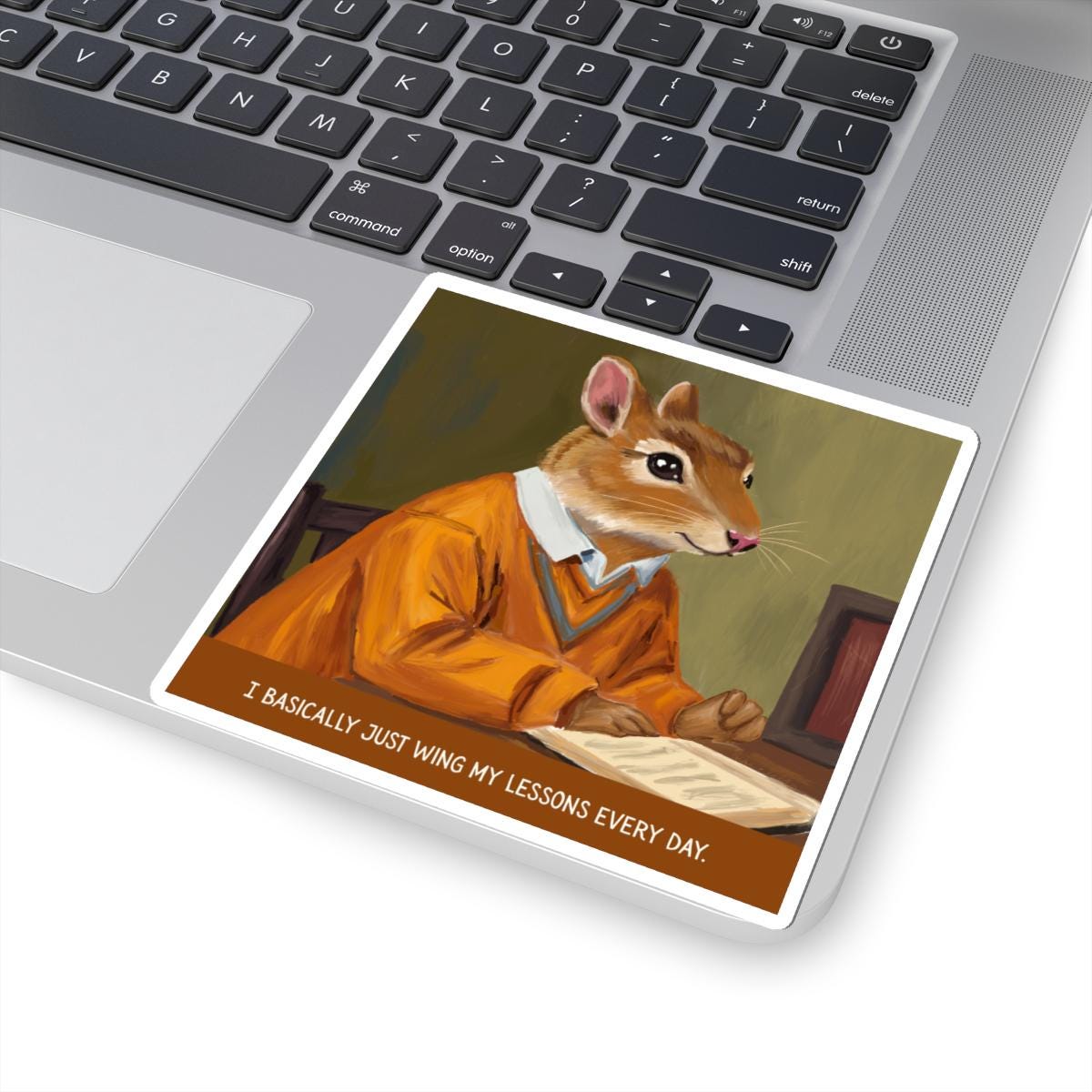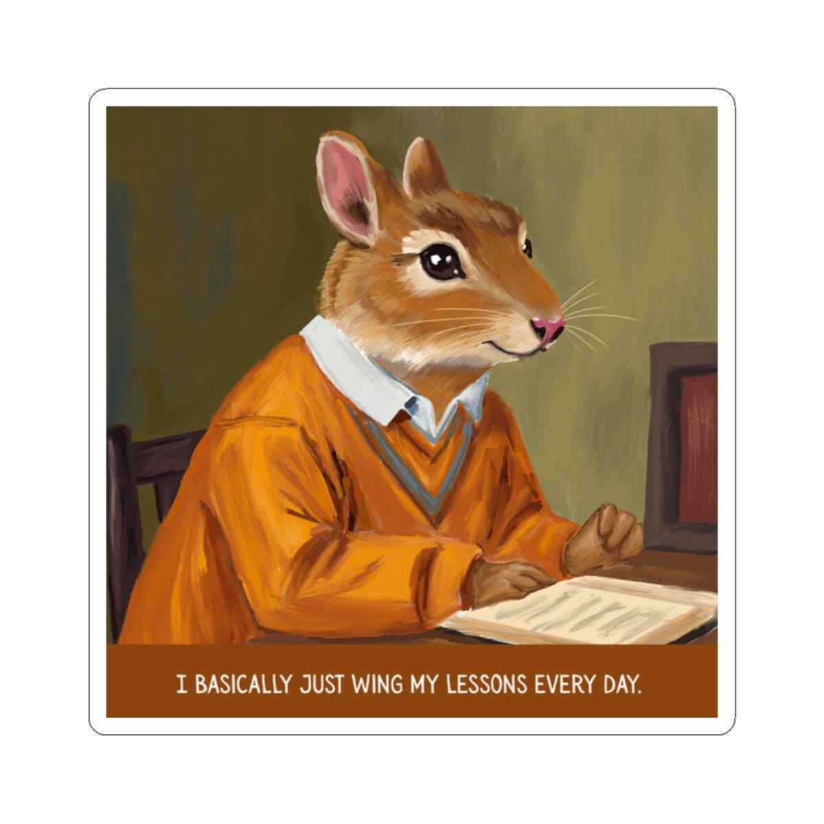 A glossy kiss-cut sticker that brings a wink of wit to laptops, journals, and any smooth flat surface. The hand-drawn illustration features a vintage chipmunk teacher in a warm orange sweater, mid-lecture, with the tongue-in-cheek caption: “I basically just wing my lessons every day.” Colors are vivid thanks to eco-solvent inks, and the scratch-resistant finish keeps the artwork bright through everyday use. Choose white or transparent backgrounds and four size options to place this charming, slightly ironic piece where it will prompt smiles—study desks, classroom binders, or your favorite notebook.