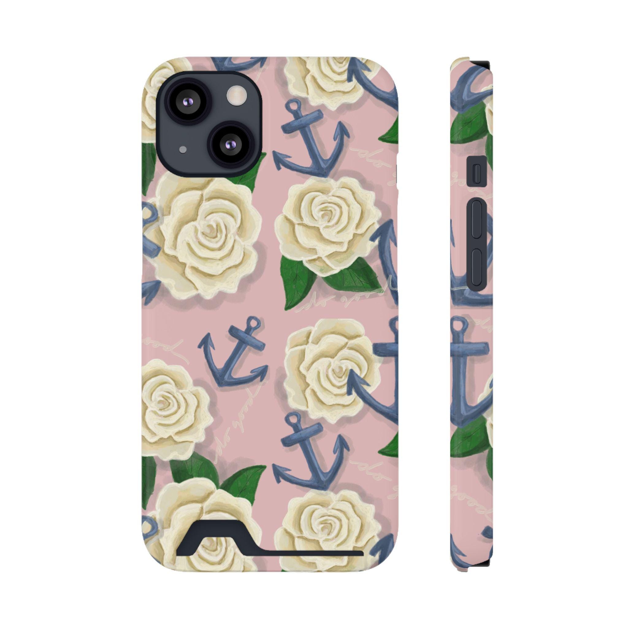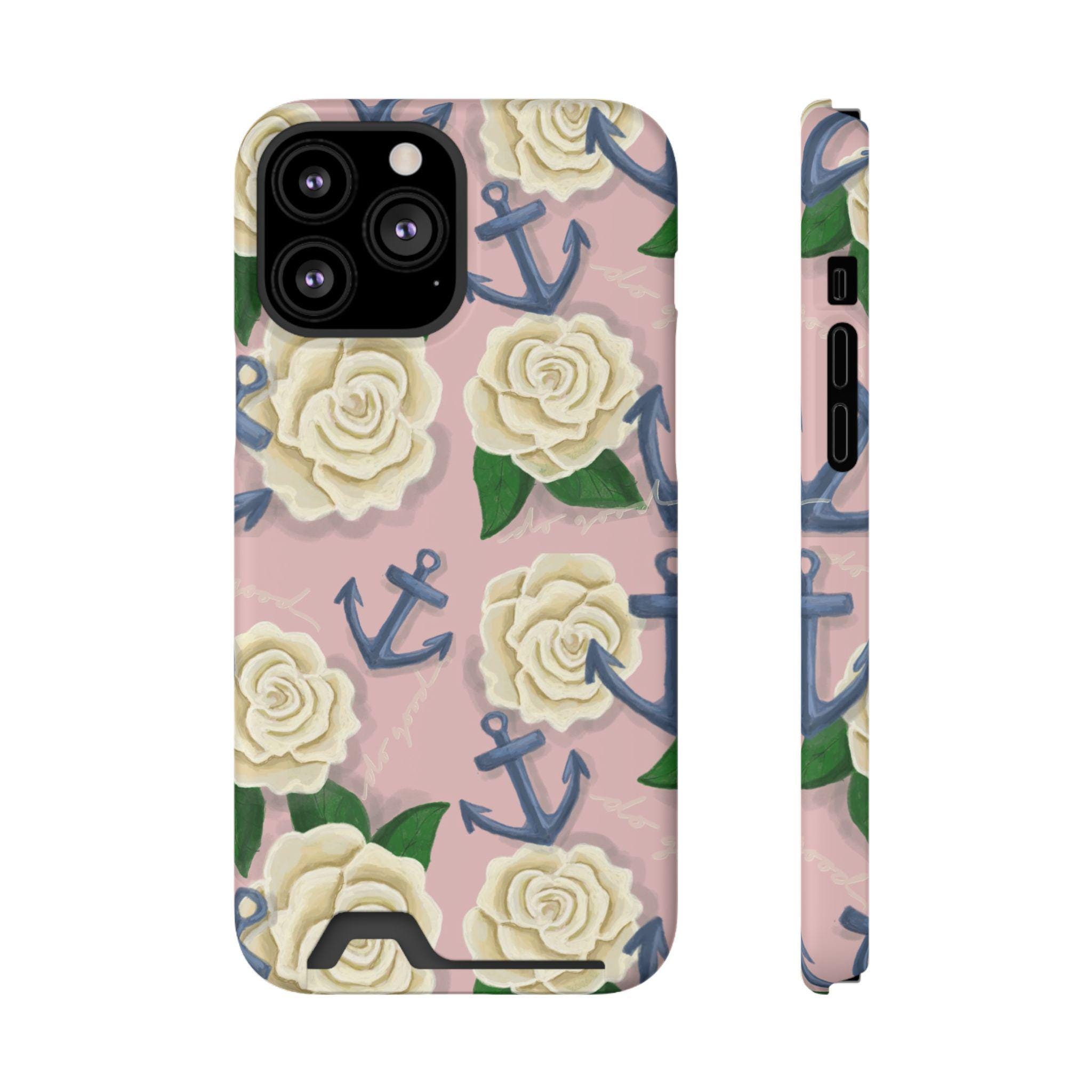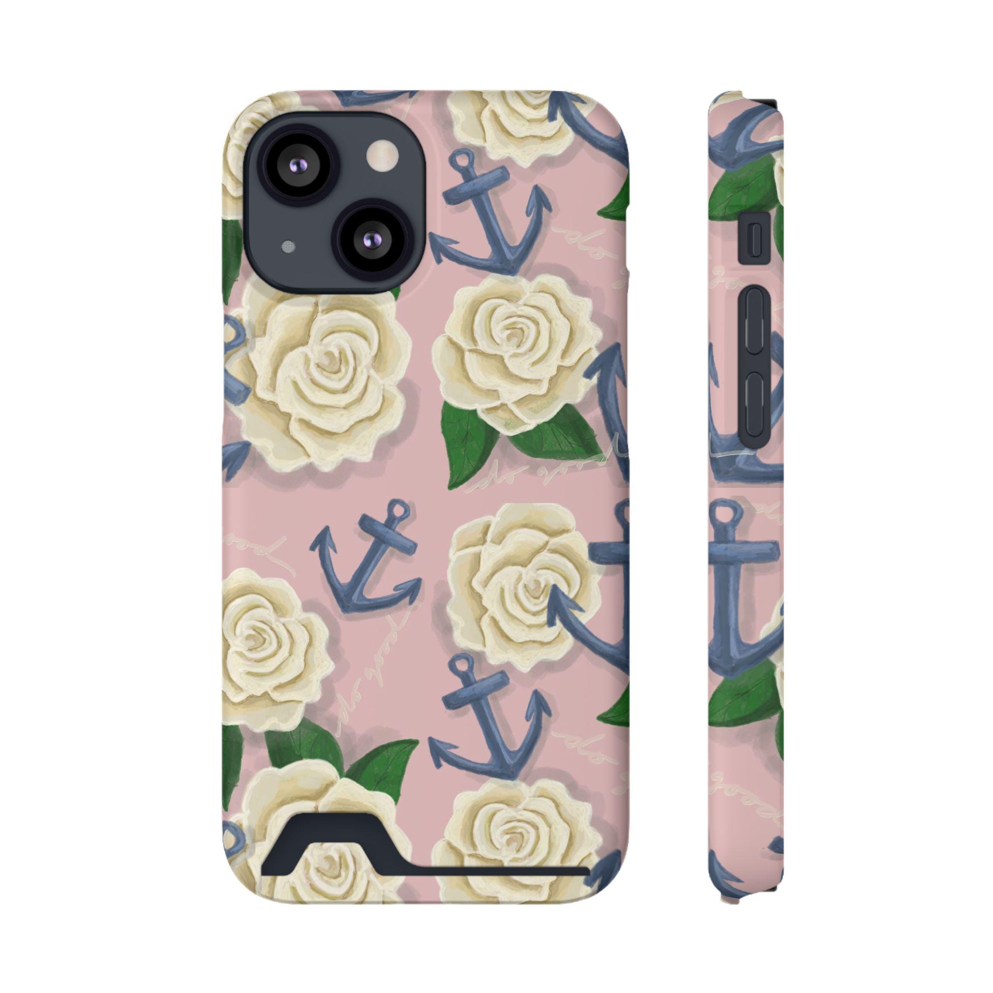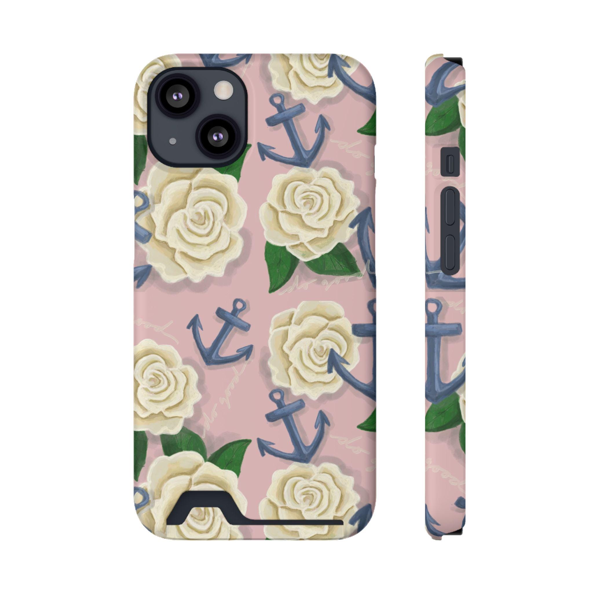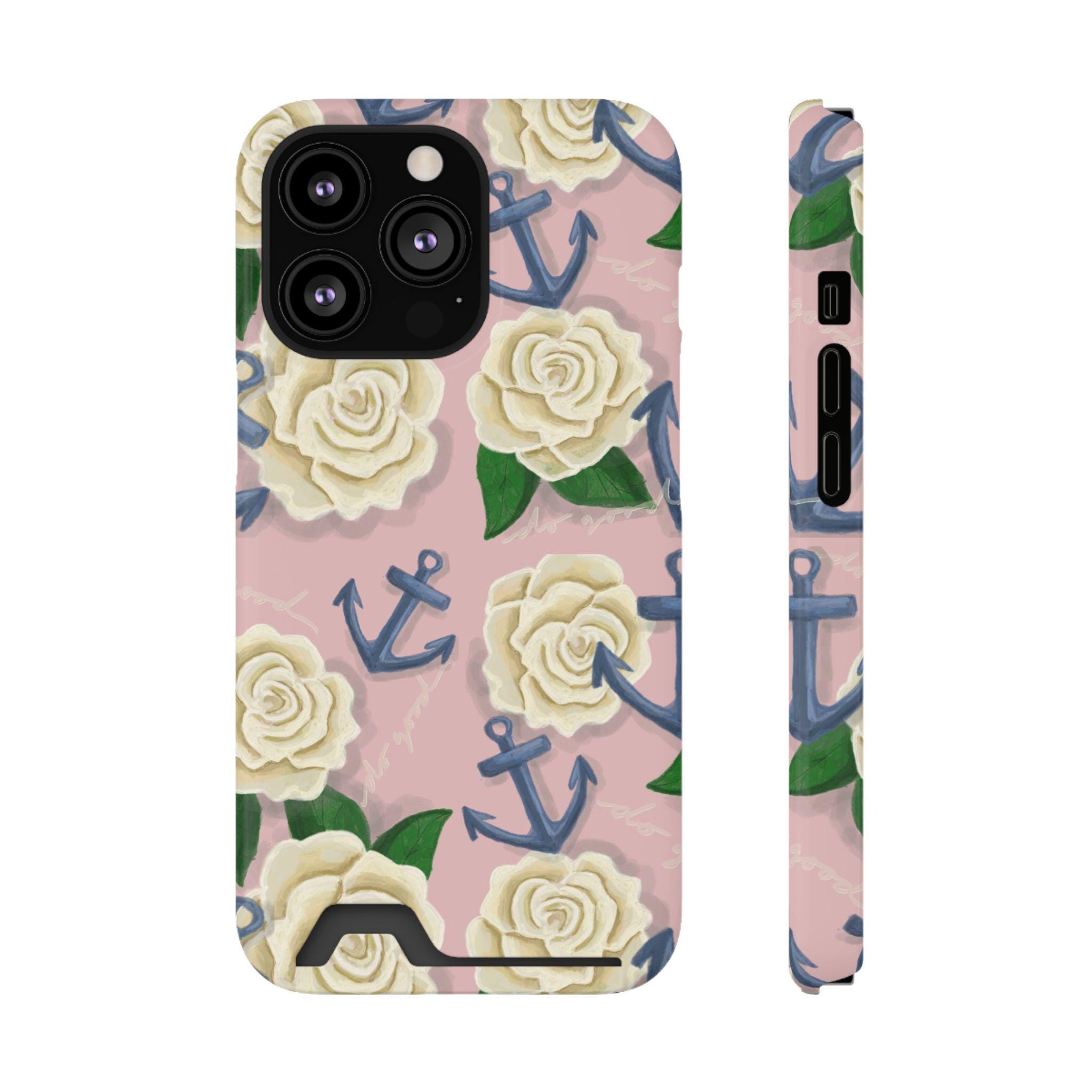 This slim card-holder phone case is the perfect gift for any Delta Gamma sister! A hand-drawn pattern is scattered with cream roses and navy anchors, blending the symbols of sisterhood. The lightweight polycarbonate shell resists impacts while keeping your phone sleek. A discreet back slot holds one card for quick trips, and the full-wrap, high-density print keeps colors vibrant from every angle. Choose glossy or matte finish, add gift packaging, and enjoy reliable MagSafe compatibility and clear port access — protection that looks thoughtful and travels light.