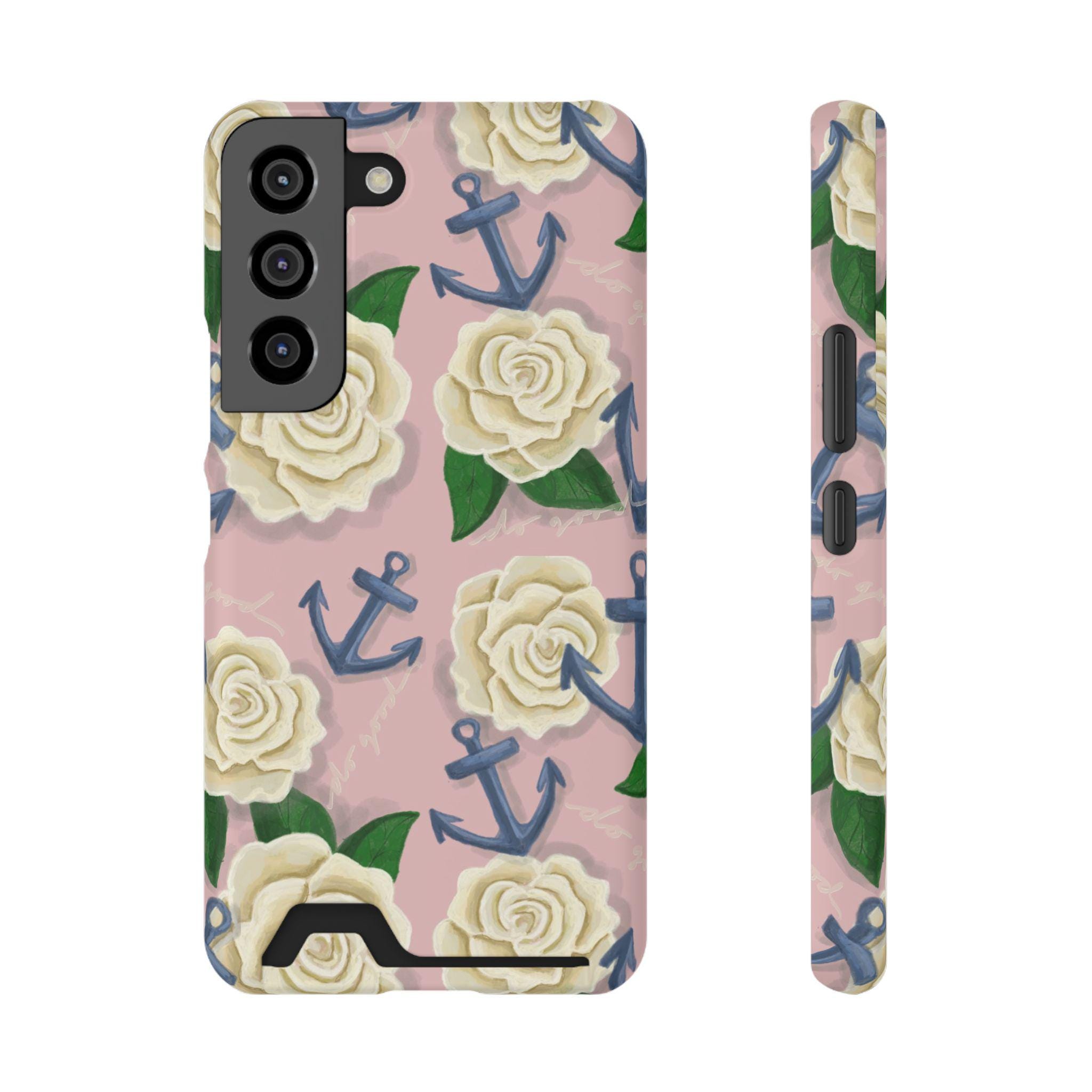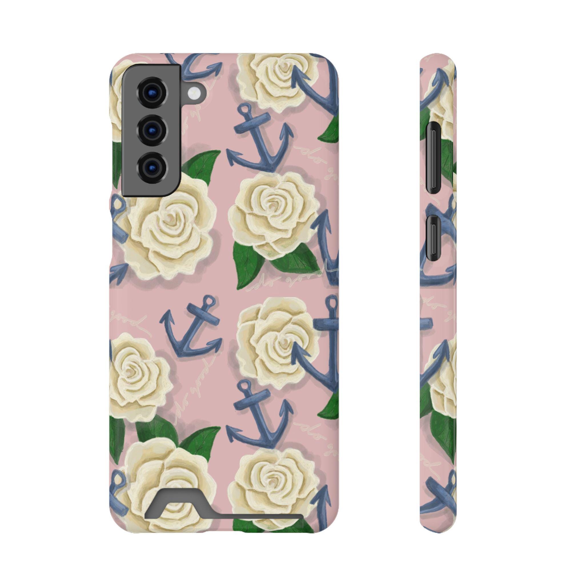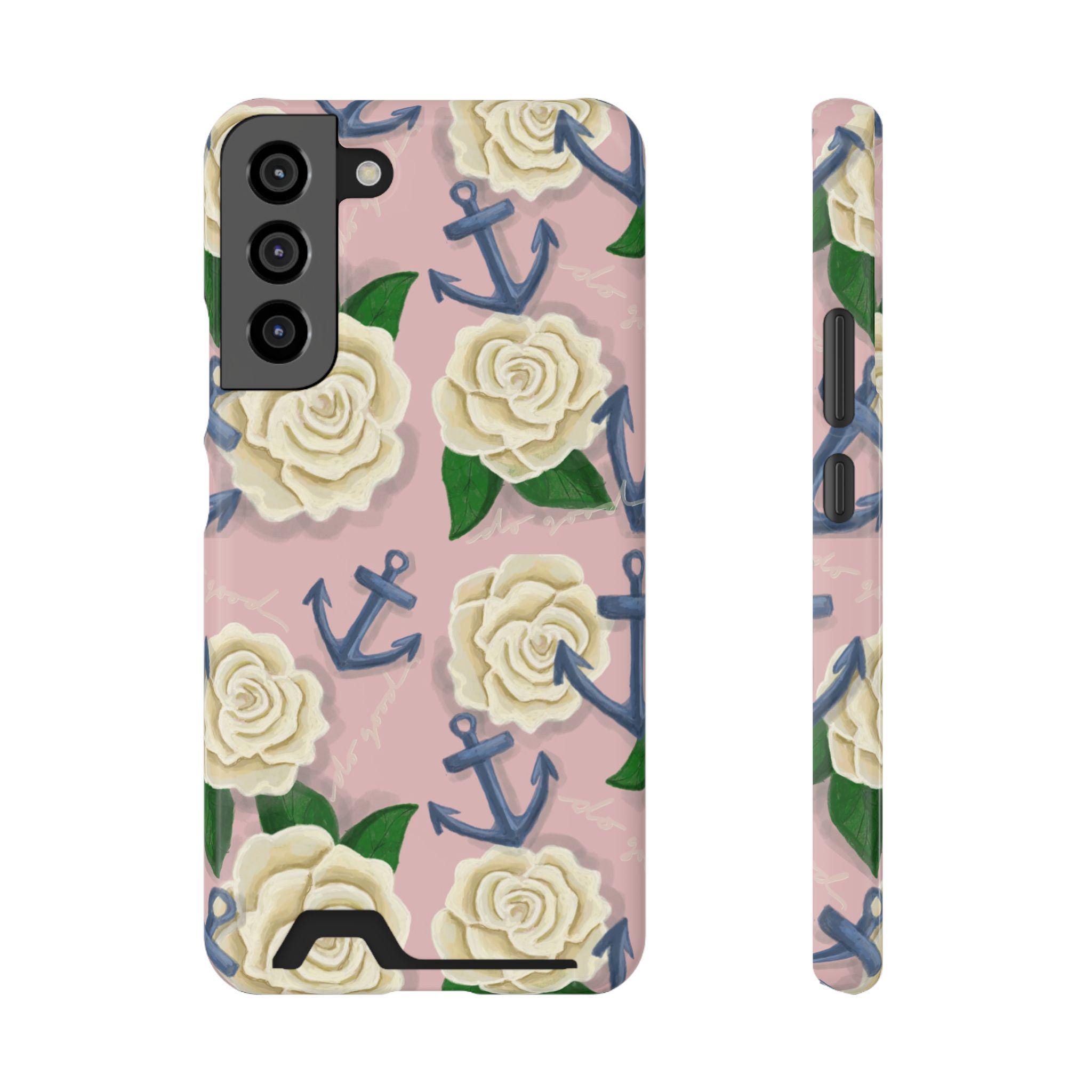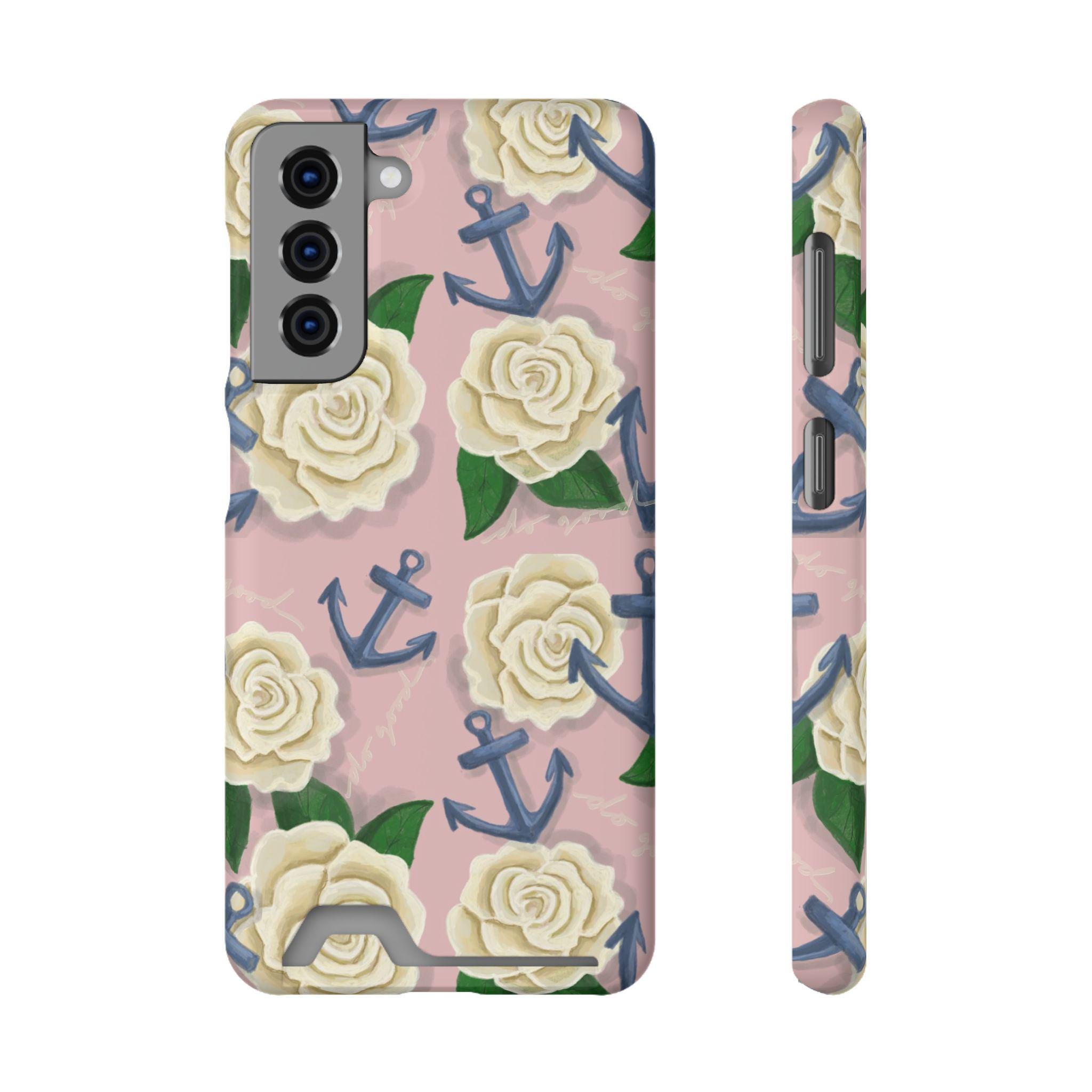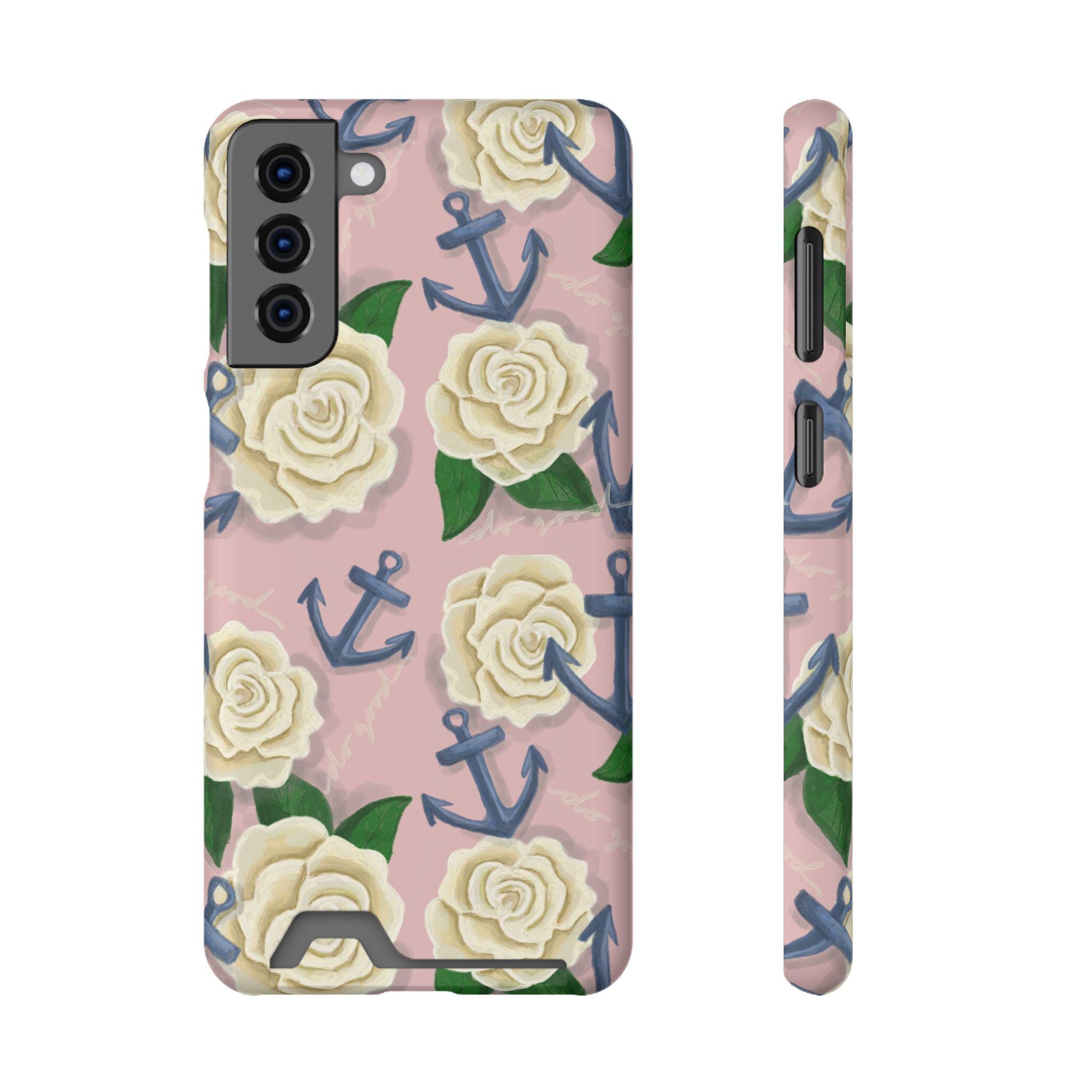 This slim card-holder phone case is the perfect gift for any Delta Gamma sister! A hand-drawn pattern is scattered with cream roses and navy anchors, blending the symbols of sisterhood. The lightweight polycarbonate shell resists impacts while keeping your phone sleek. A discreet back slot holds one card for quick trips, and the full-wrap, high-density print keeps colors vibrant from every angle. Choose glossy or matte finish, add gift packaging, and enjoy reliable MagSafe compatibility and clear port access — protection that looks thoughtful and travels light.