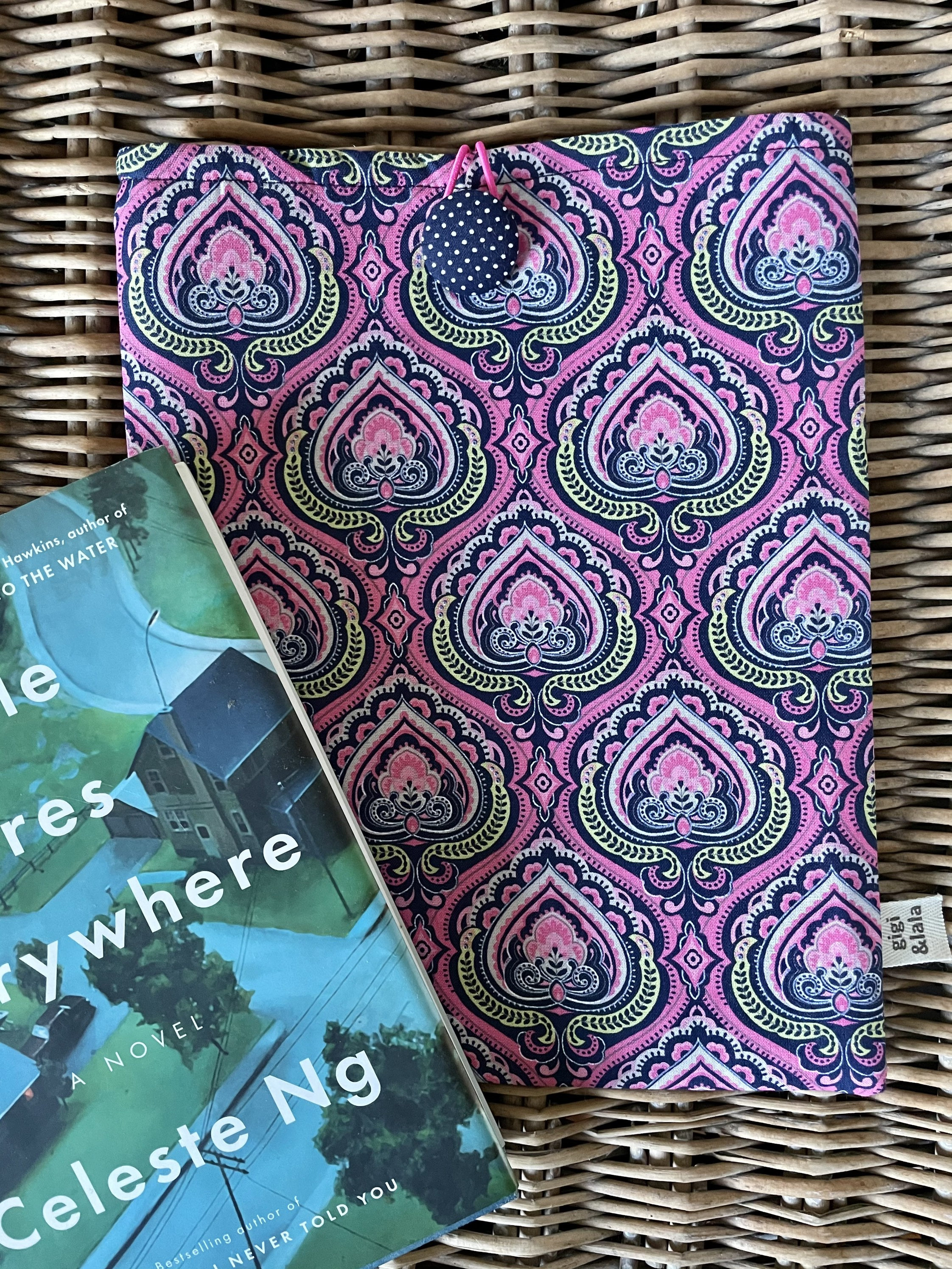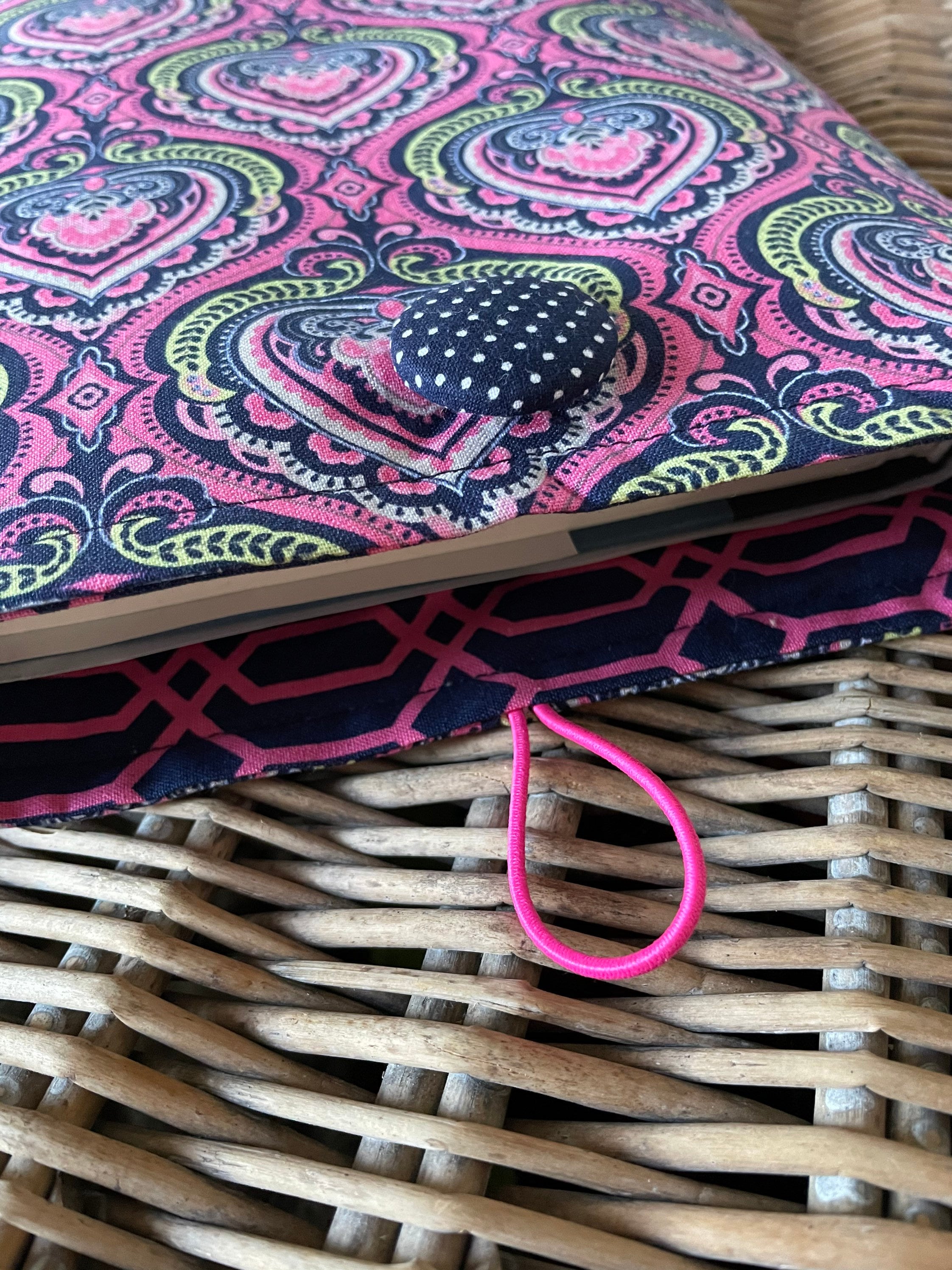A handmade padded pouch to keep your books safe while traveling or while in your handbag. Cotton fabric, lined with a coordinating cotton and padded with fleece. Elastic and button closure. Two sizes: softcover (7.5”x9.5”), and hardcover (8.5”x11”). Can be used as a tablet pouch as well!